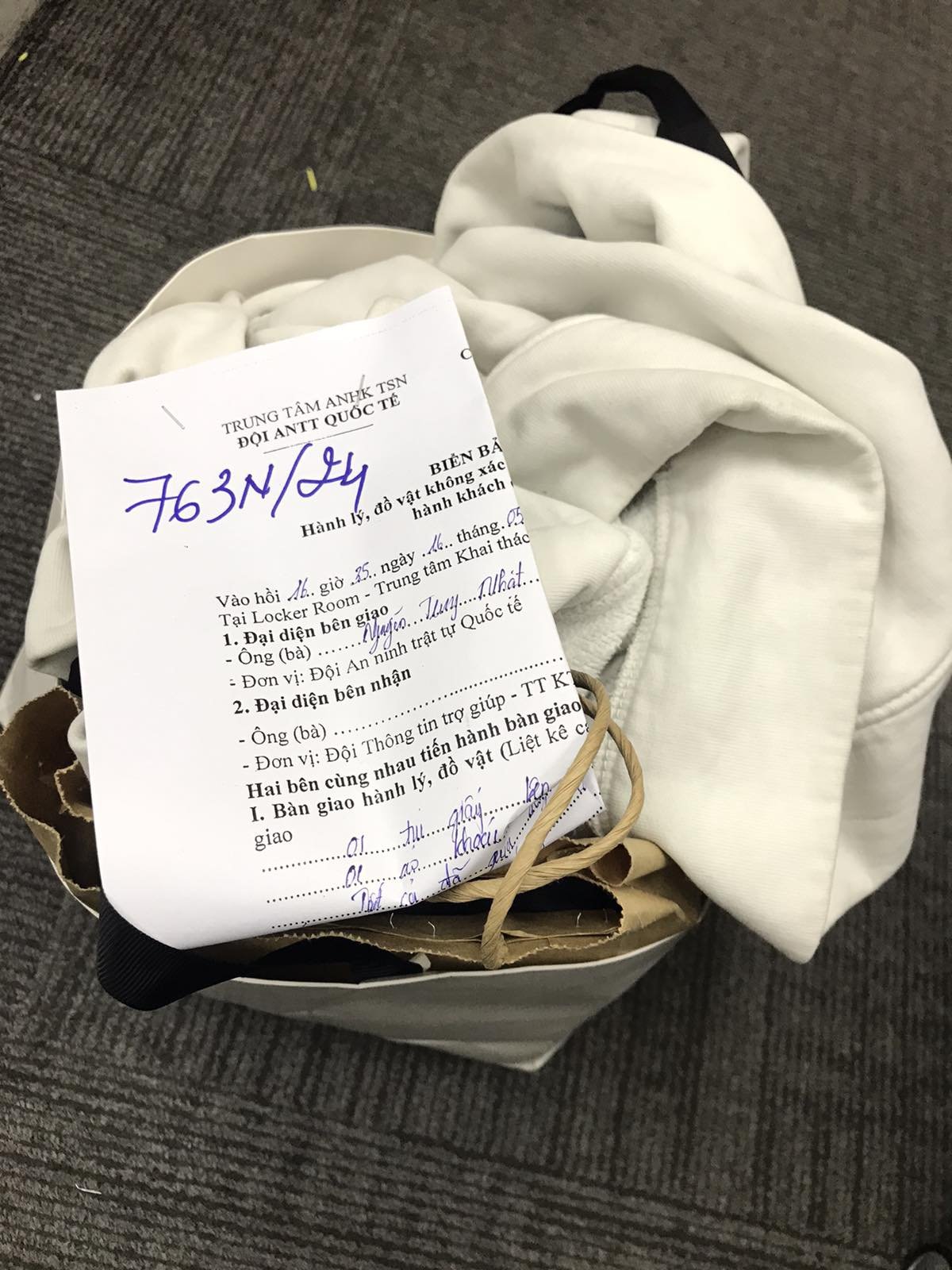 Ngày tiếp nhận: 16/5/2024 Mã hồ sơ: 763N2024 dùng cá nhân, 01 áo khoác vải màu trắng, tất cả đã qua sử dụng. |