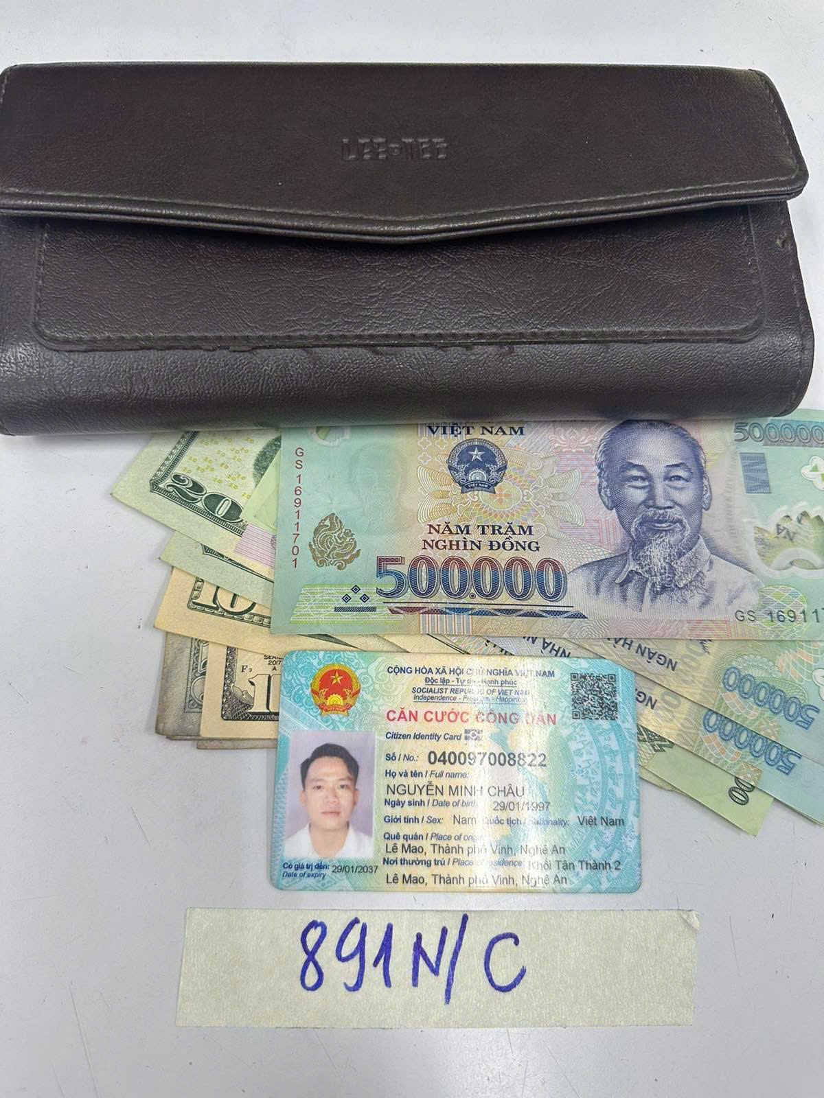 Ngày tiếp nhận: 14/5/2025 Mã hồ sơ: 891N2025C Mô tả: 01 ví da màu nâu có chữ "LEE TEE", bên trong ví có: 01 (một) thẻ visa MB tên NGUYÊN MINH CHÂU, 01 (một) thẻ visa TECHCOMBANK tên NGUYỄN MINH CHÂU, 01 (một) thẻ BIDV tên NGUYỄN MINH CHÂU, 01 (một) thẻ bảo hiểm PJCO VIETTEL GROUP tên NGUYỄN MINH CHÂU, 01 (một) giấy chứng minh nhân dân tên NGUYỄN MINH CHÂU, 01 (một) căn cước công dân tên NGUYỄN MINH CHÂU, 01 (một) giấy phép lái xe tên NGUYỄN MINH CHÂU, 01 (một) thẻ sinh viên trường Đại học Bách Khoa Hà Nội tên NGUYỄN MINH CHÂU, 01 (một) thẻ National Social Security Fund tên NGUYỄN MINH CHÂU, 01 (một) số International Certificate of Vaccination or Prophylaxis, 03 (ba) tờ tiền mệnh giá 500.000VND, 04 (bốn) tờ tiền mệnh giá 100.000VND, 01 (một) tờ tiền mệnh giá 50.000 VND, 02 (hai) tờ tiền mệnh giá 20 USD, 02 (hai) tờ tiền mệnh giá 10 USD, 02 tờ tiền mệnh giá 5 USD, 01 (một) tờ tiền mệnh giá 2 USD, 01 (một) tờ tiền mệnh giá 1 USD. |