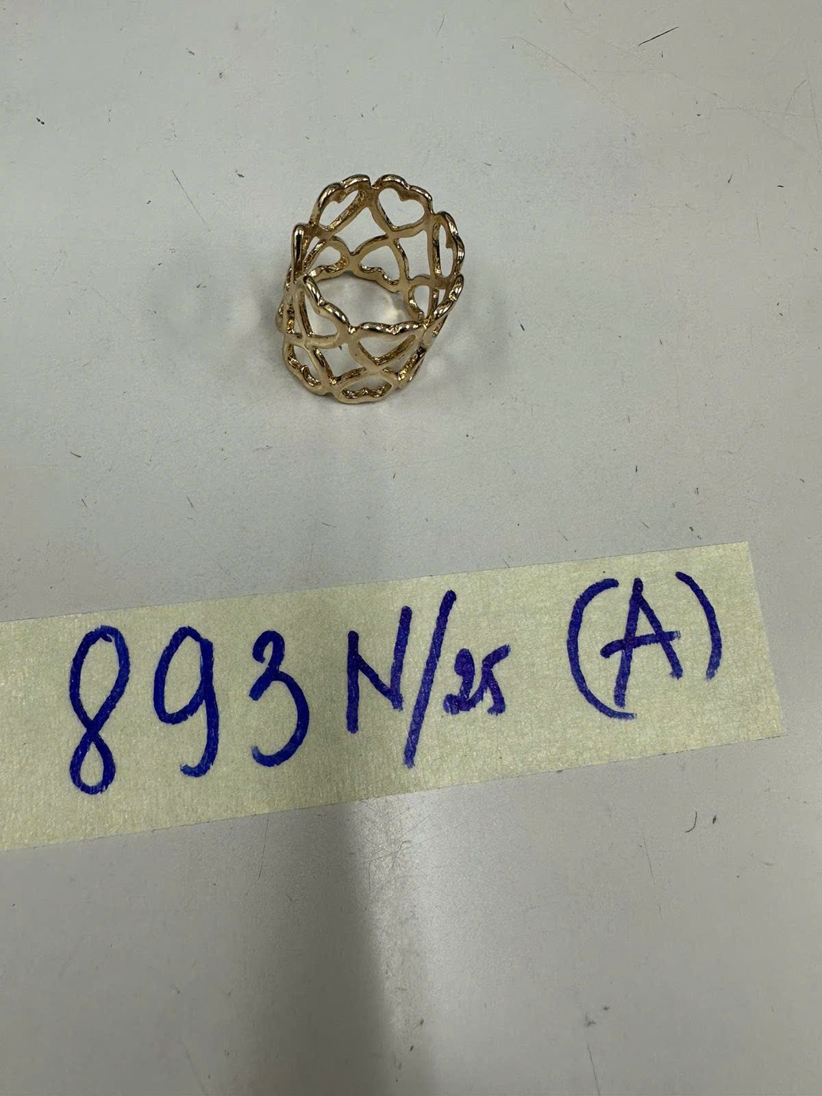 Ngày tiếp nhận: 14/5/2025 Mã hồ sơ: 893N2025A Mô tả: 01 nhẫn bằng kim loại màu vàng có hình trái tim. |