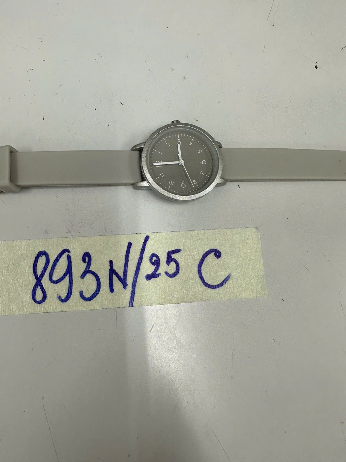 Ngày tiếp nhận: 14/5/2025 Mã hồ sơ: 893N2025C Mô tả: 01 đồng hồ kim màu xám có chữ "NATTITO", dây bằng nhựa màu xám. |
