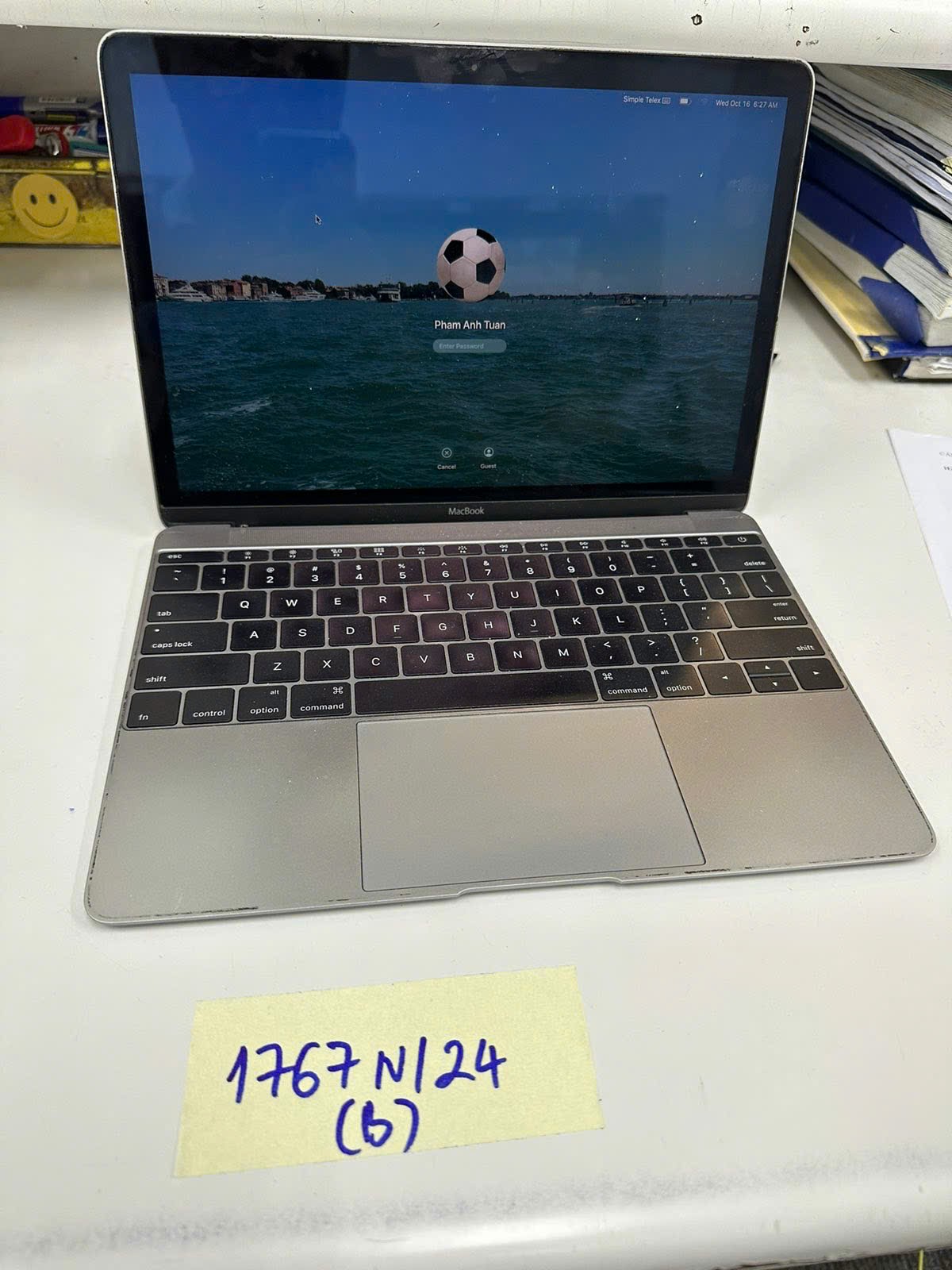 Ngày tiếp nhận: 16/10/2024 logo "MACBOOK AIR" Model: PA2179, S/N: FVFCVE2SMNHR có ốp trắng trong. |