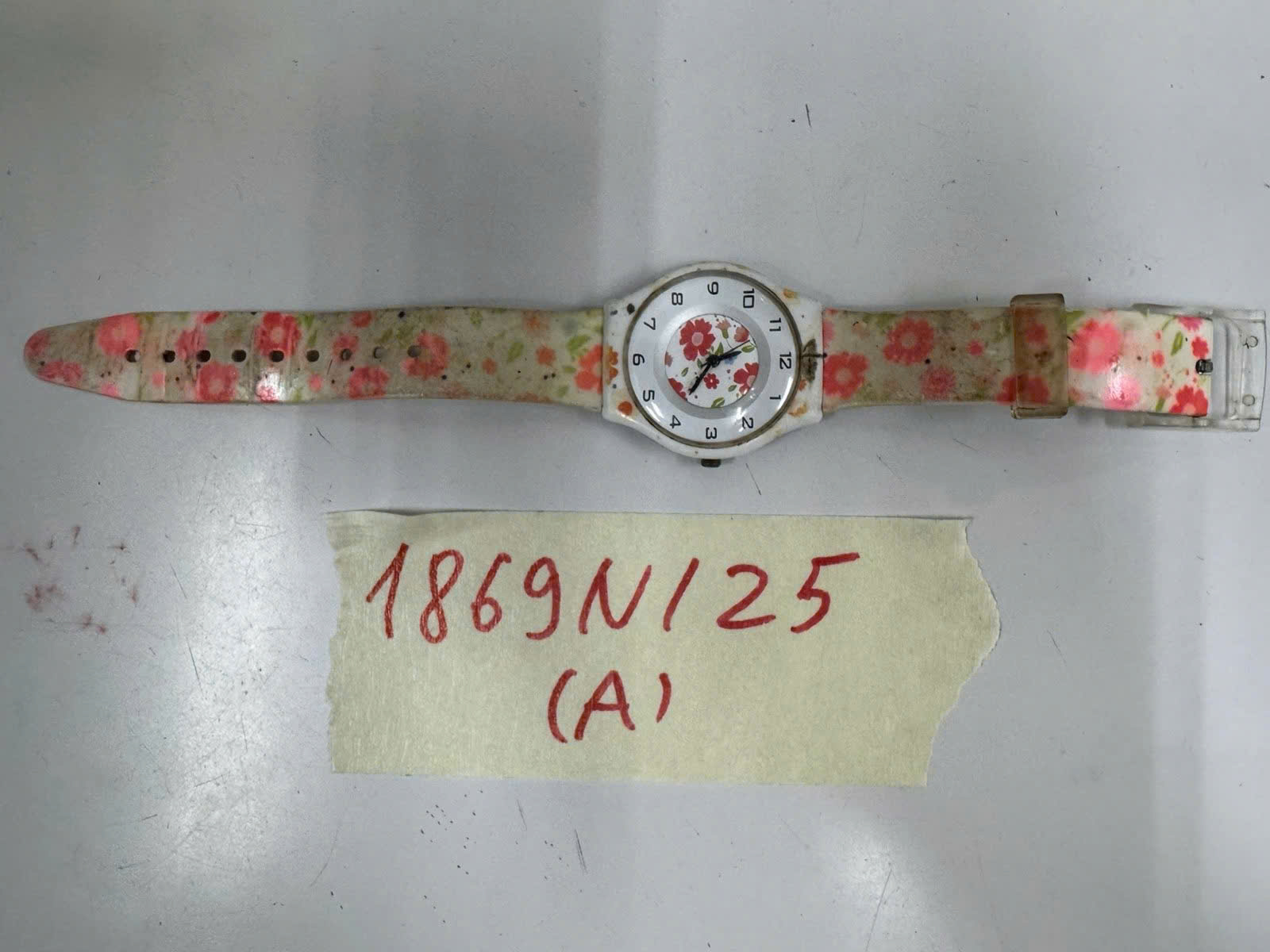Ngày tiếp nhận: 17/10/2025 Mã hồ sơ: 1869N2025A Mô tả: 01 đồng hồ nhựa dây nhựa có họa tiết hoa, mặt sau in dòng chữ "MERVEILLES DU MONDE". |
