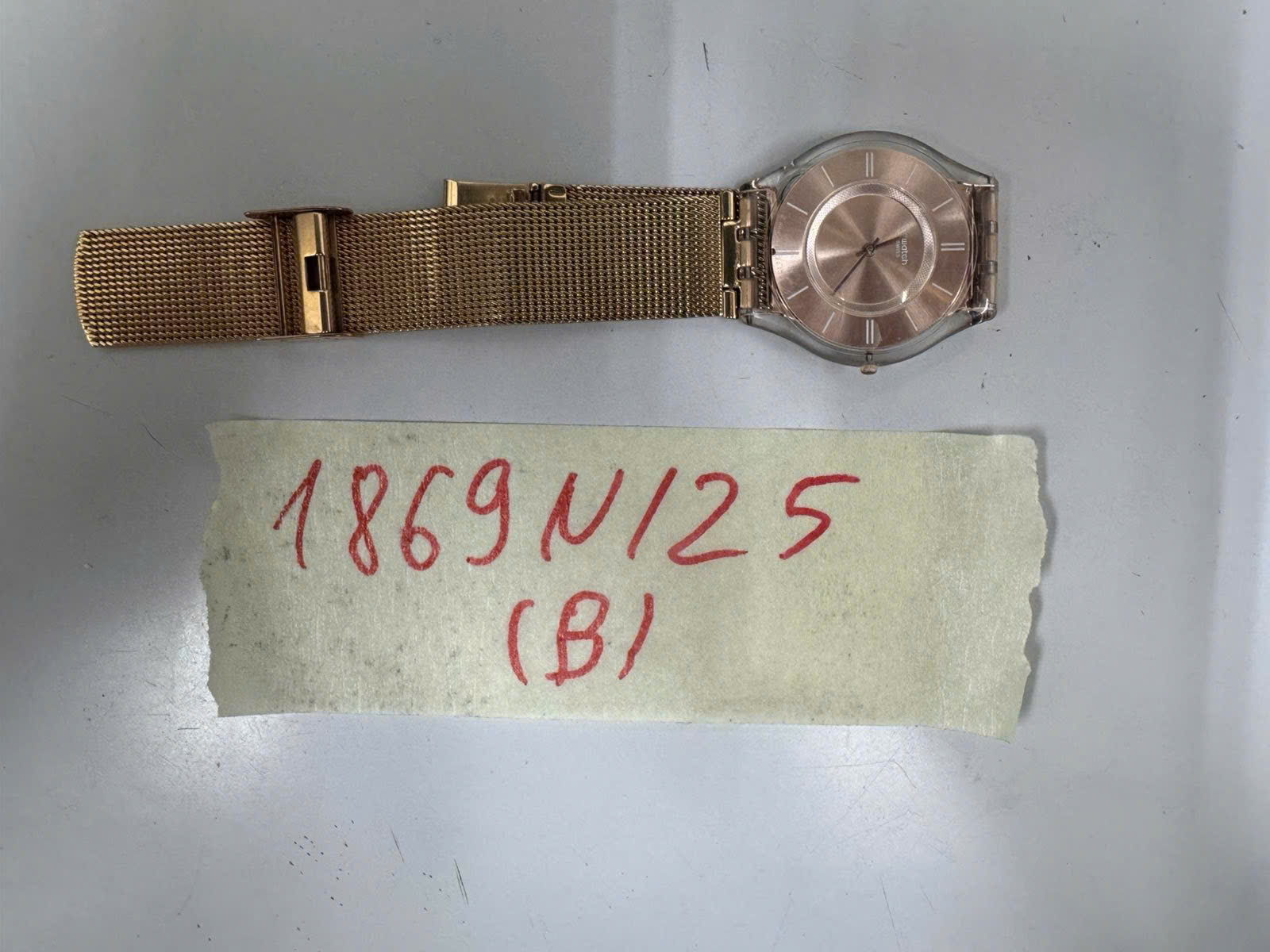 Ngày tiếp nhận: 17/10/2025 Mã hồ sơ: 1869N2025B Mô tả: 01 đồng hồ "SWATCH" dây kim loại màu vàng. |