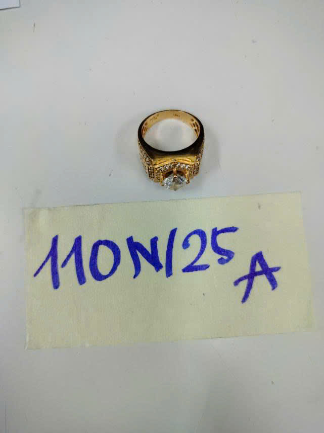 Ngày tiếp nhận: 16/01/2025 Mã hồ sơ: 110N2025A Mô tả: 01 nhẫn màu vàng bên trên có đính hạt và 01 viên đá trắng, bên trong có chữ "TCÚC 17K. |