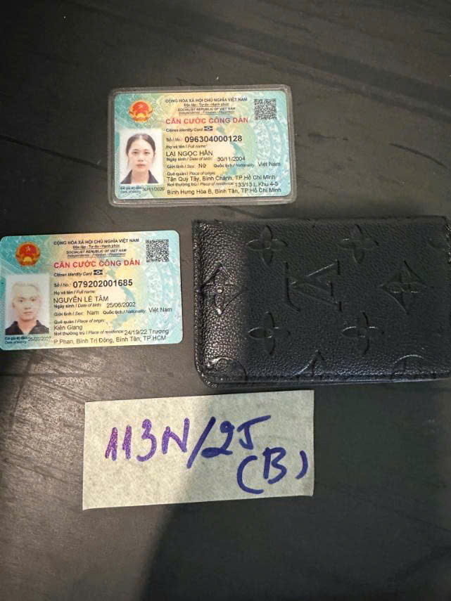 Ngày tiếp nhận: 17/01/2025 Mã hồ sơ: 113N2025B Mô tả: 01 ví tiền màu đen có chữ LV bên trong có 01căn cước công dân mang tênNguyễn Lê Tâm, 01 thẻ visa ngân hàng Sacombank mang tên Nguyen Le Tam, 01 căn cước công dân mang tên Lại Ngọc Hân . |