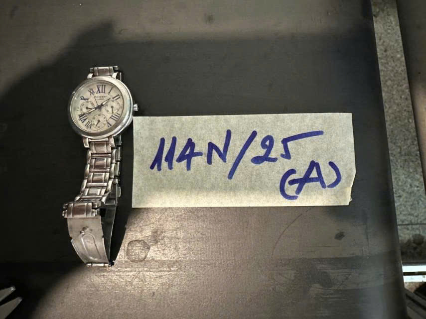 Ngày tiếp nhận: 17/01/2025 Mã hồ sơ: 118N2025A Mô tả: 01 đồng hồ mặt tròn, dây kim loại màu bạc, có chữ "FESTINA SATM WATER RESIST QUART. |