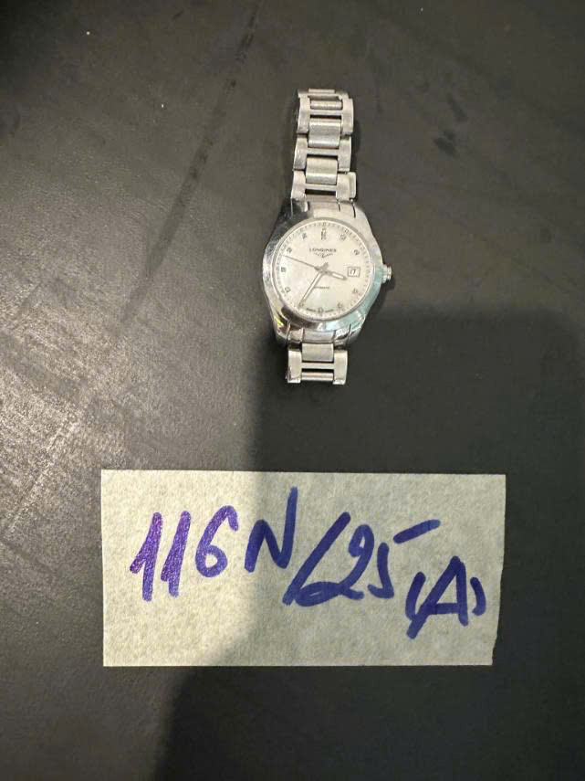 Ngày tiếp nhận: 17/01/2025 Mã hồ sơ: 116N2025A Mô tả: 01 đồng hồ mặt hình tròn có chữ Longines, dây đeo kim loại màu trắng. |
