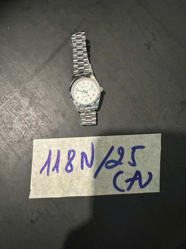 Ngày tiếp nhận: 17/01/2025 Mã hồ sơ: 118N2025B Mô tả: 01 đồng hồ mặt tròn, dây kim loại màu bạc, có chữ "PROKING". |
