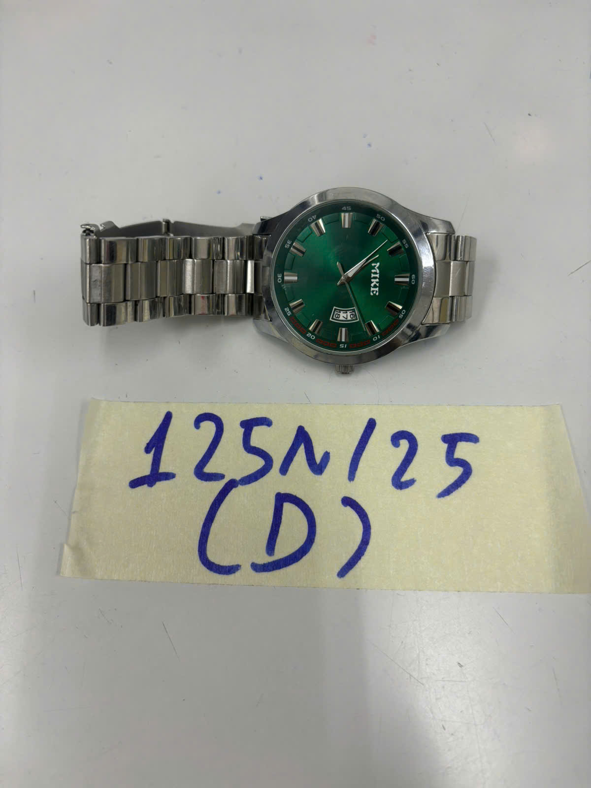Ngày tiếp nhận: 17/01/2025 Mã hồ sơ: 125N2025D Mô tả: 01 đồng hồ kim loại mặt màu xanh lá cây có chữ "Mike". |