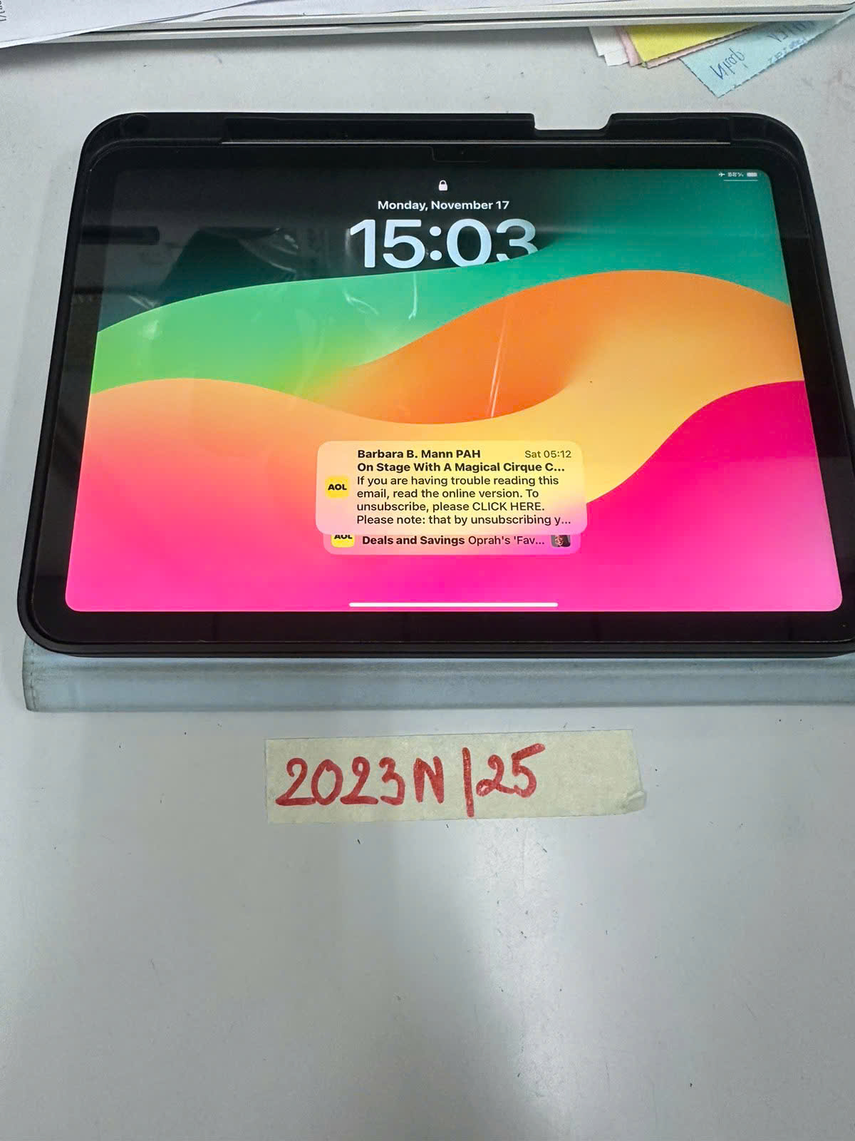 Ngày tiếp nhận: 17/11/2025 Mã hồ sơ: 2023N2025 Mô tả: 01 Máy tính bảng màu bạc hiệu APPLE có serial M59C0029P2 ,ốp lưng màu xanh nước biển.