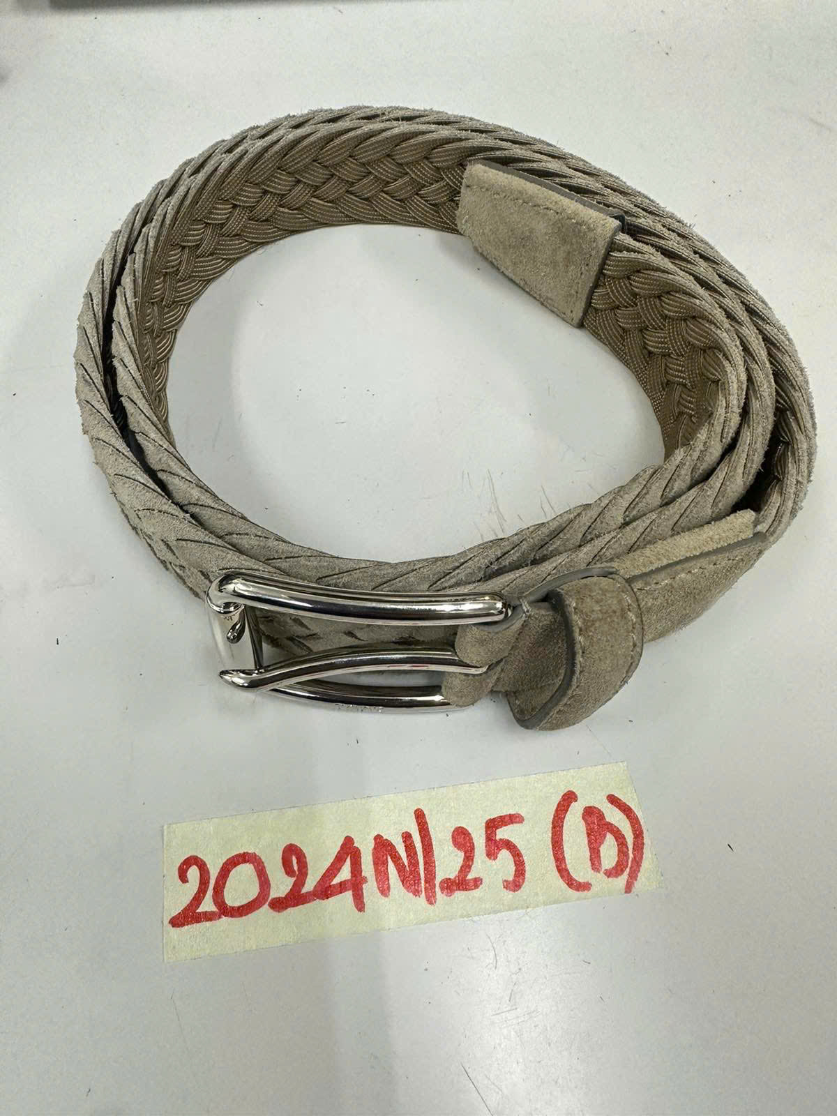 Ngày tiếp nhận: 17/11/2025 Mã hồ sơ: 2024N2025B Mô tả: 01 Dây thắt lưng màu xám ,dây kim loại màu trắng chữ TOD'S made in ITALY GENUINE LEATHER F852-95. |