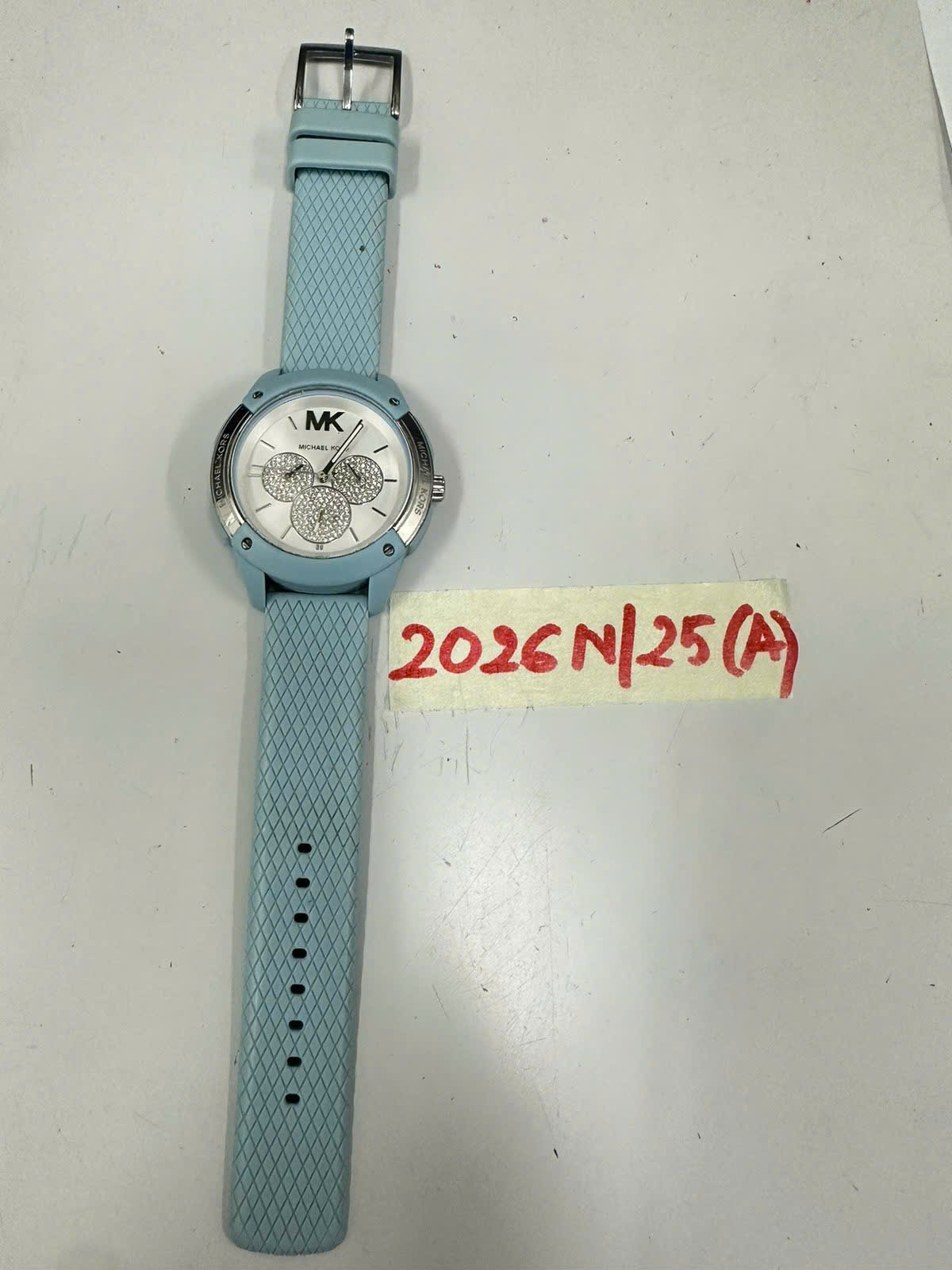 Ngày tiếp nhận: 17/11/2025 Mã hồ sơ: 2026N2025A Mô tả: 01 đồng hồ mặt tròn màu xanh nhạt có chữ MICHAEL KORS ,kèm dây cao su màu xanh nhạt. |