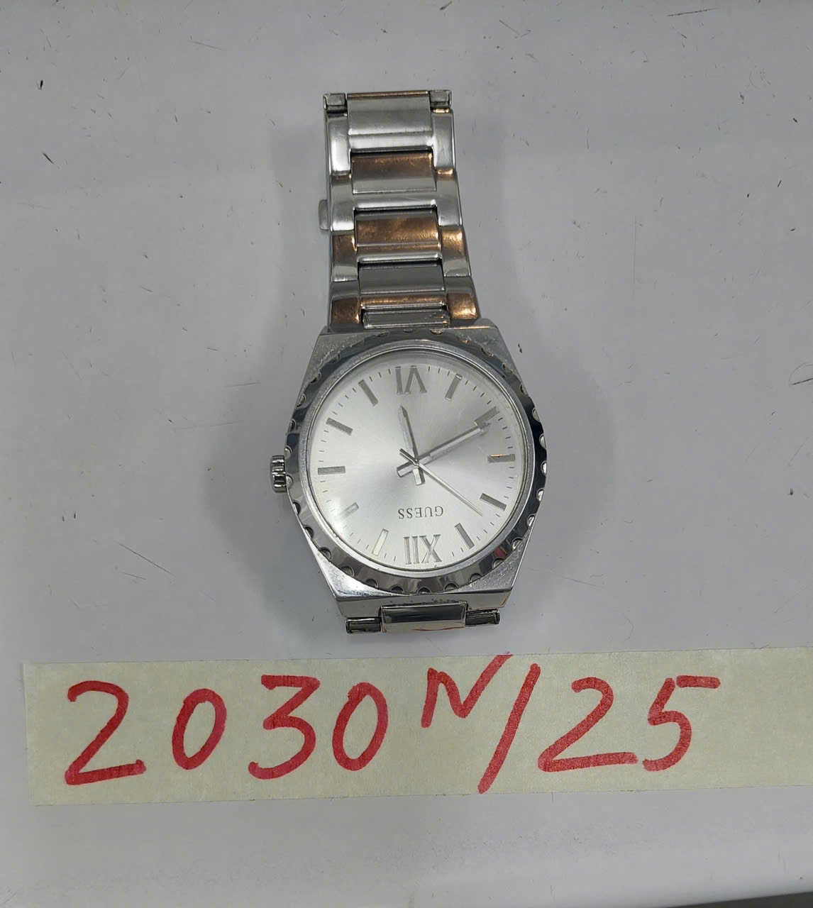 Ngày tiếp nhận: 18/11/2025 Mã hồ sơ: 2030N2025 Mô tả: 01 đồng hồ đeo tay bằng kim loại màu trắng, có chữ GUESS. |