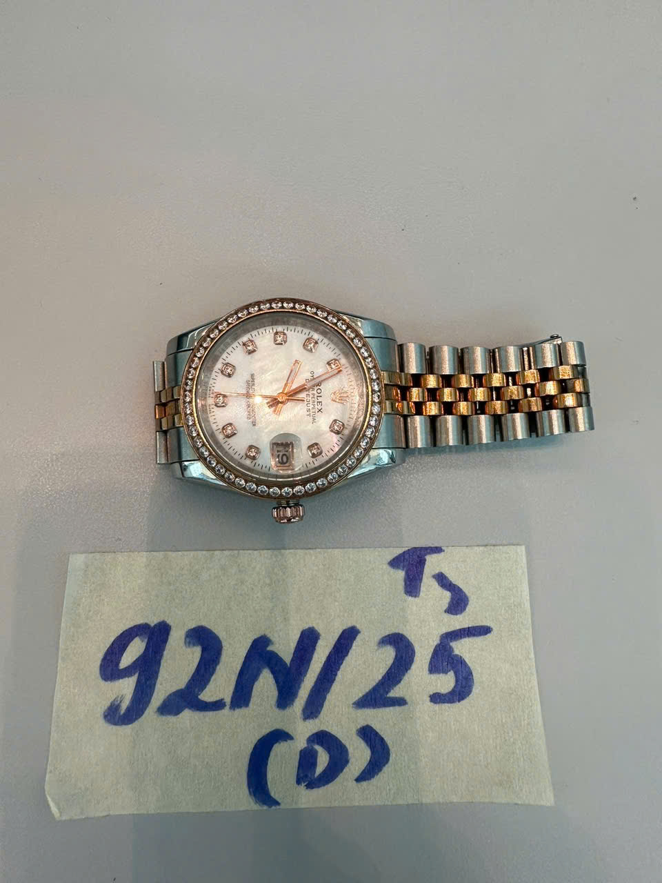 Ngày tiếp nhận: 16/11/2025 Mã hồ sơ: 92N2025D Mô tả: 01 đồng hồ dây kim loại màu trắng - vàng, mặt tròn có đính hột, trong mặt đồng hồ có chữ ROLEX. |