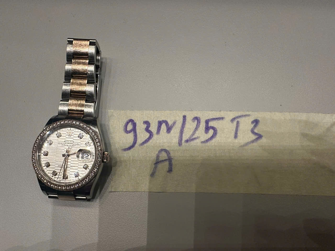 Ngày tiếp nhận: 16/11/2025 Mã hồ sơ: 93N2025A Mô tả: 01 đồng hồ màu trắng có ghi chữ ROLEX, dây kim loại màu trắng - vàng, đã sử dụng. |