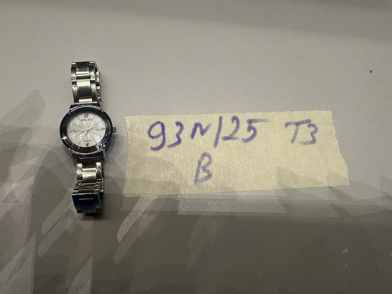 Ngày tiếp nhận: 16/11/2025 Mã hồ sơ: 93N2025B Mô tả: 01 đồng hồ màu trắng có ghi chữ HALEI, dây trắng, mặt kim loại, đã sử dụng. |