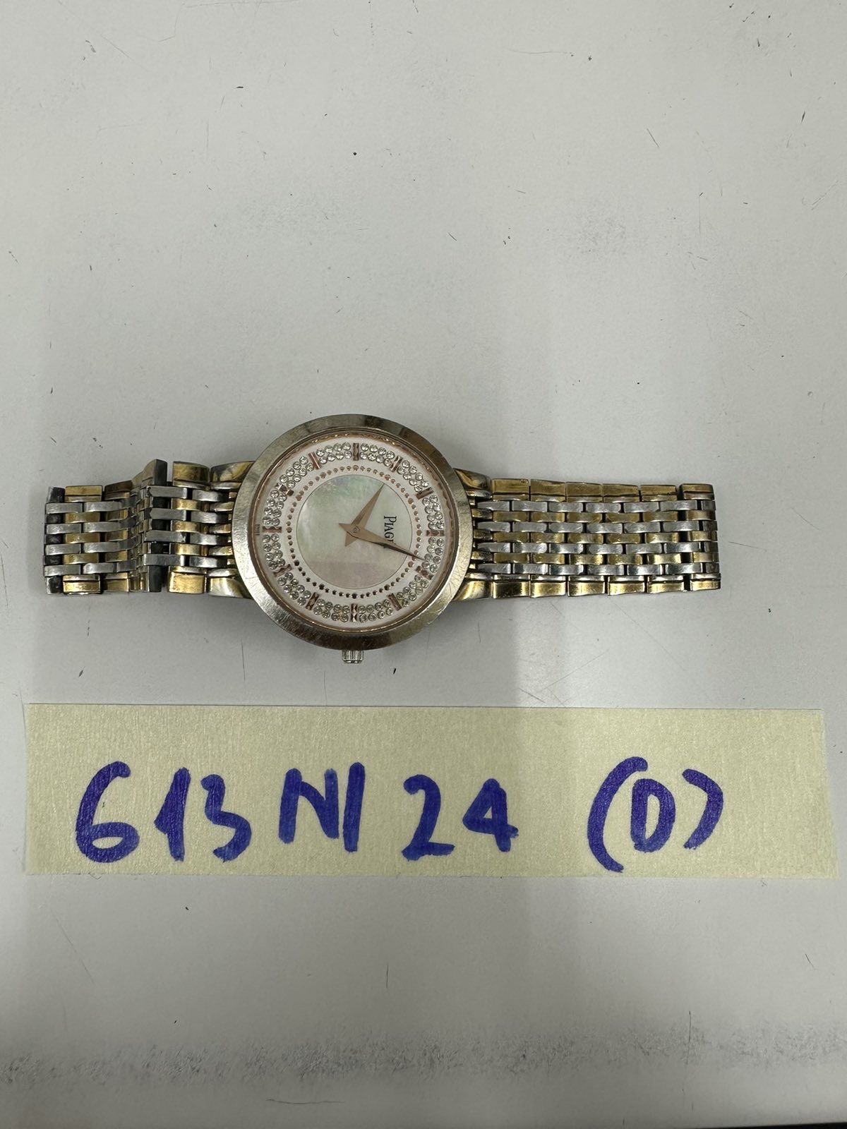 Ngày tiếp nhận: 17/4/2024 bạc và vàng trên mặt đồng hồ có đính đá và có chữ PIAGET. |