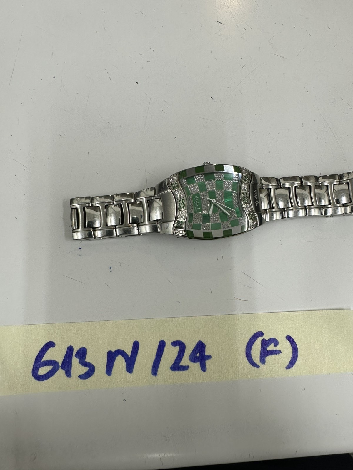 Ngày tiếp nhận: 17/4/2024 bạc trên mặt đồng hồ màu xanh lá cây và có chữ TROFISH. |