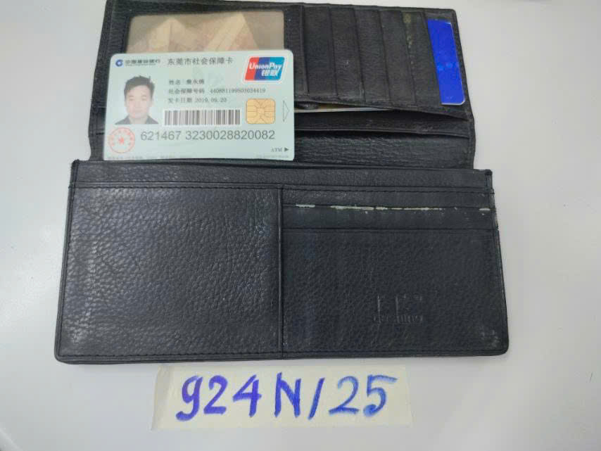 Ngày tiếp nhận: 18/5/2025 Mã hồ sơ: 924N2025 Mô tả: 01 ví da màu đen có: 43NDT, 06 thẻ nhựa có tên người nước ngoài. |