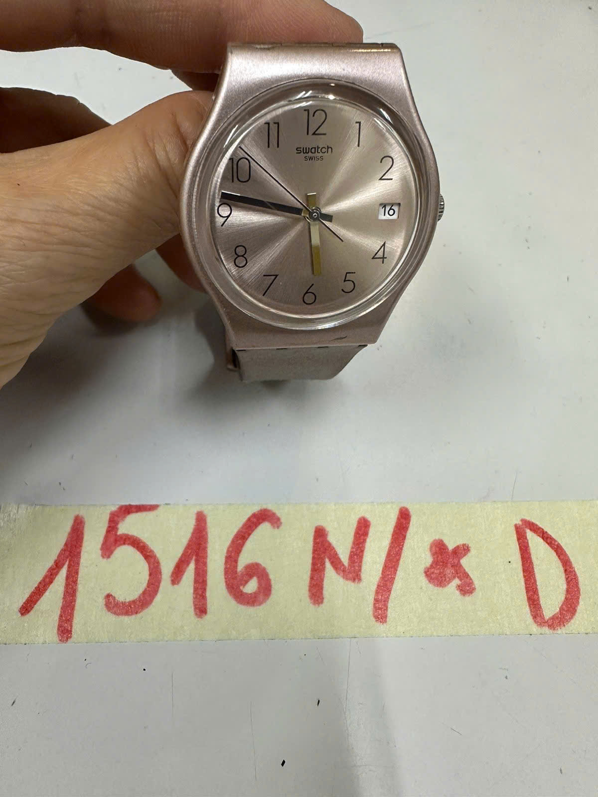 Ngày tiếp nhận: 16/8/2025 Mã hồ sơ: 1516N2025D Mô tả: 01 đồng hồ mặt hình tròn màu vàng đồng có chữ Swatch, dây đeo cao su màu vàng đồng. |