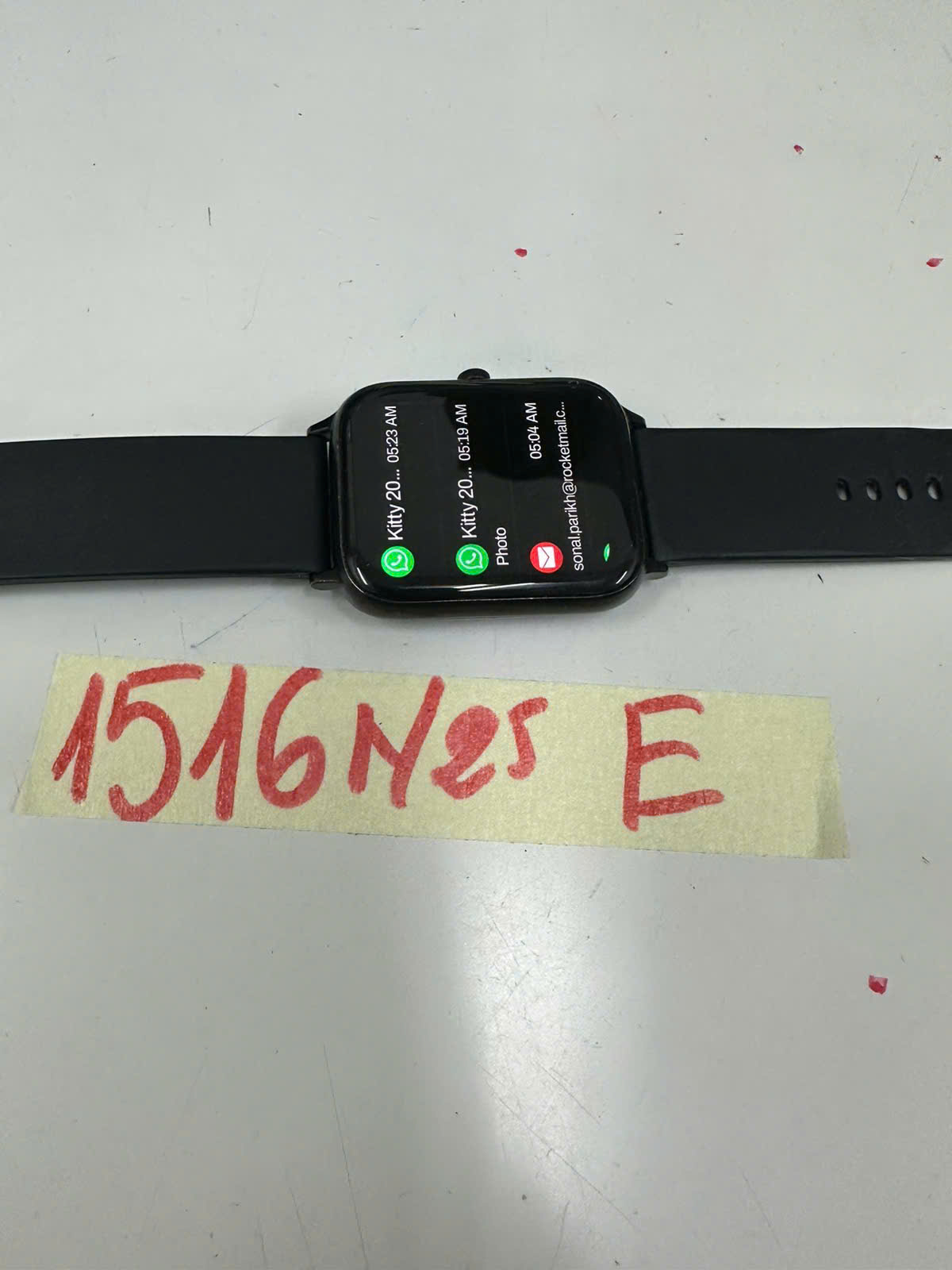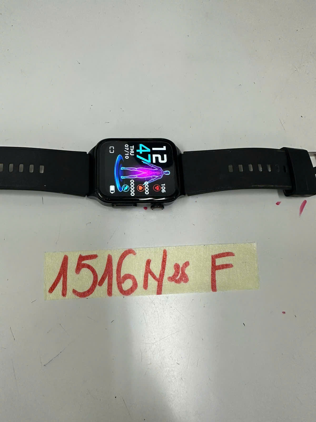 Ngày tiếp nhận: 16/8/2025 Mã hồ sơ: 1516N2025E Mô tả: 01 đồng hồ thông minh mặt hình chữ nhật màu đen, dây đeo cao su màu đen. |
