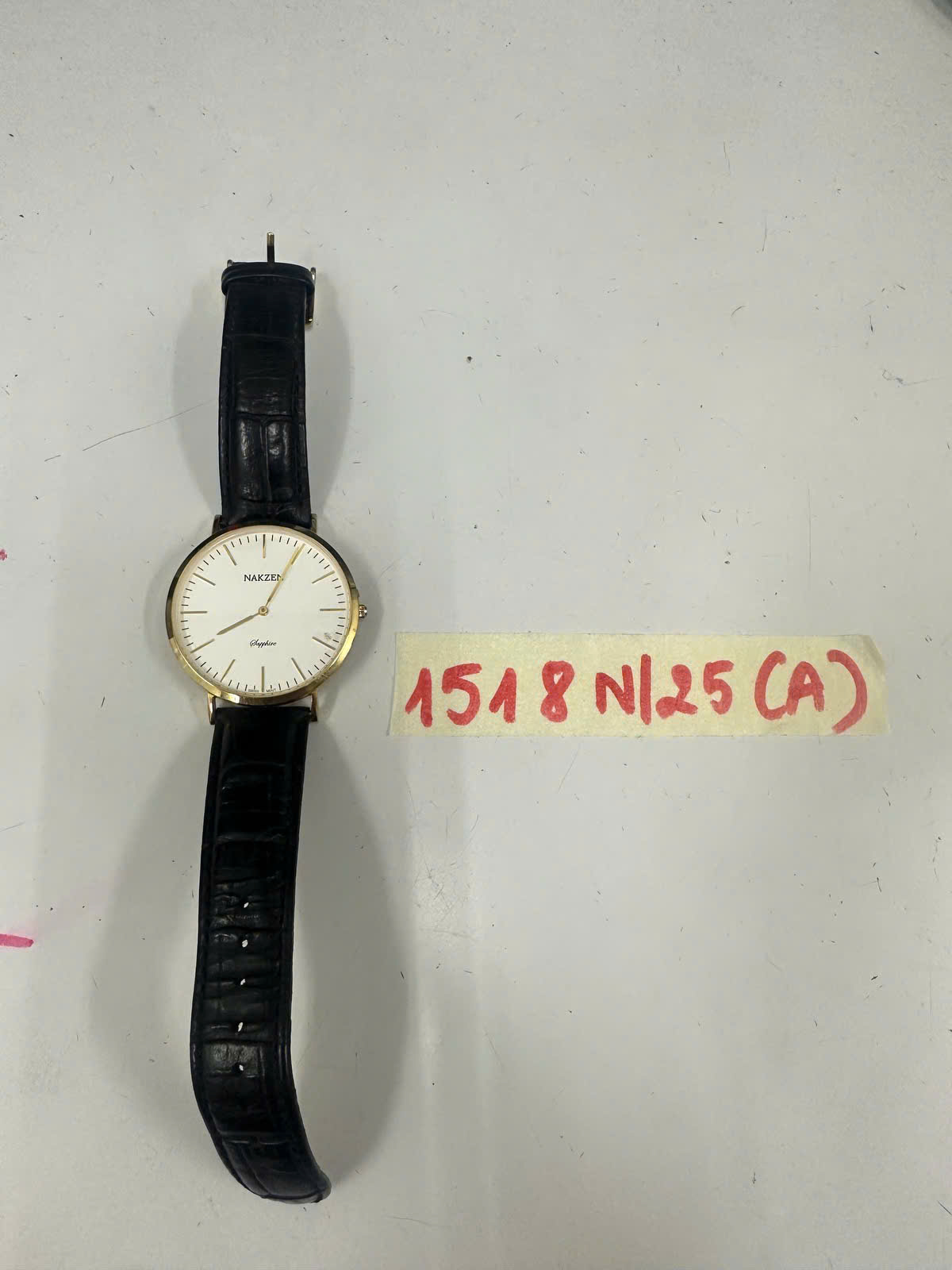 Ngày tiếp nhận: 16/8/2025 Mã hồ sơ: 1518N2025A Mô tả: 01 đồng hồ dây da màu đen, mặt đồng hồ màu trắng có chữ NAKZEN. |