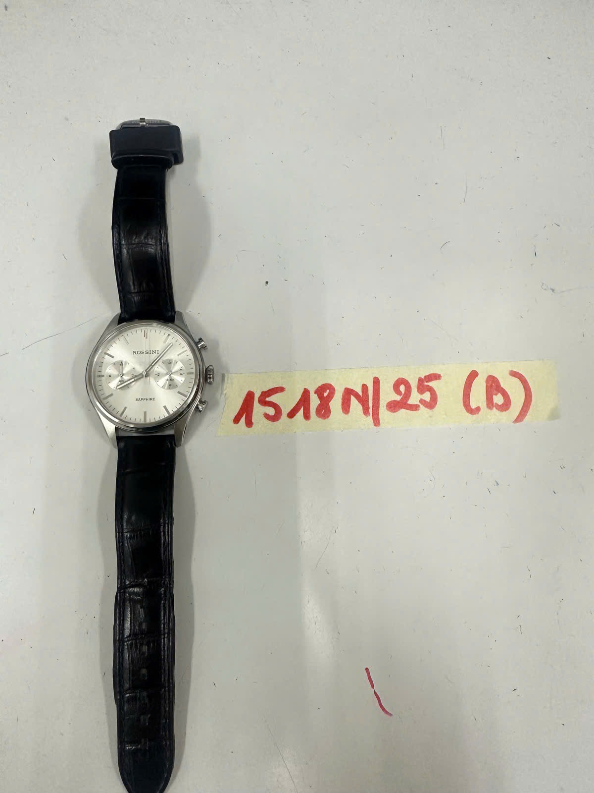 Ngày tiếp nhận: 16/8/2025 Mã hồ sơ: 1518N2025B Mô tả: 01 đồng hồ mặt tròn dây kim loại màu trắng có ghi chữ ROSSINI dây da màu đen. |
