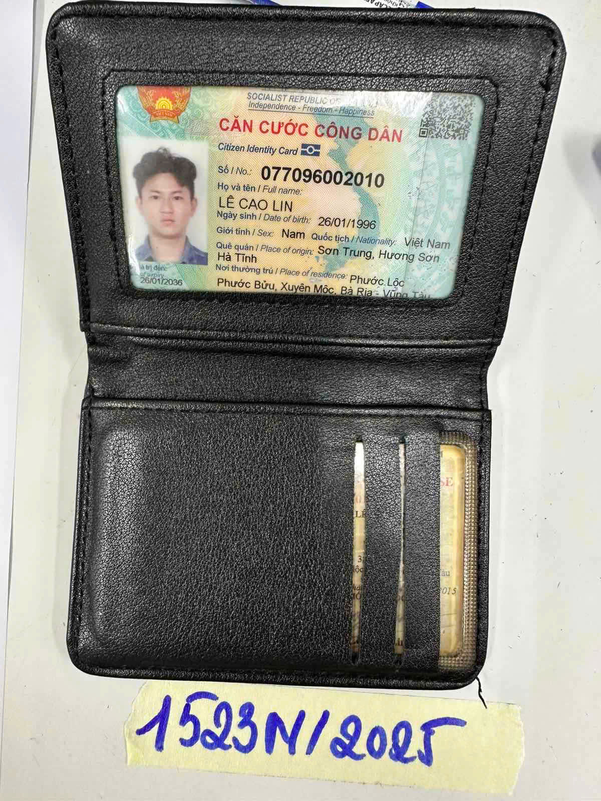 Ngày tiếp nhận: 17/8/2025 Mã hồ sơ: 1523N2025 Mô tả: 01 ví màu đen bên trong có chứa 01 cccd Lê cao Lin, 02 giấy phép lái xe, 01 đăng ký xe máy, số tiền 2.261.000vnd. |