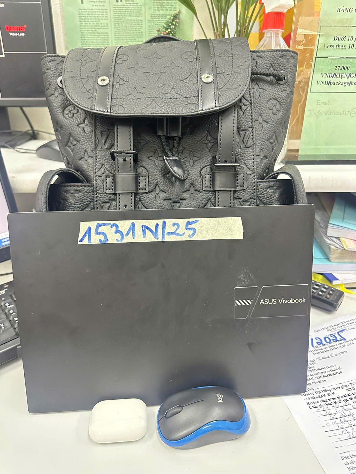 Ngày tiếp nhận: 19/8/2025 Mã hồ sơ: 1531N2025 Mô tả: 01 túi da màu đen có chữ LV, 01 laptop hiệu ASUS VIVOBOOK màu đen cũ, 01 hộp tai nghe có 02 tai nghe màu trắng cũ, 01 con chuột máy tính hiệu LOGI cũ, dây sạc và củ sạc. |