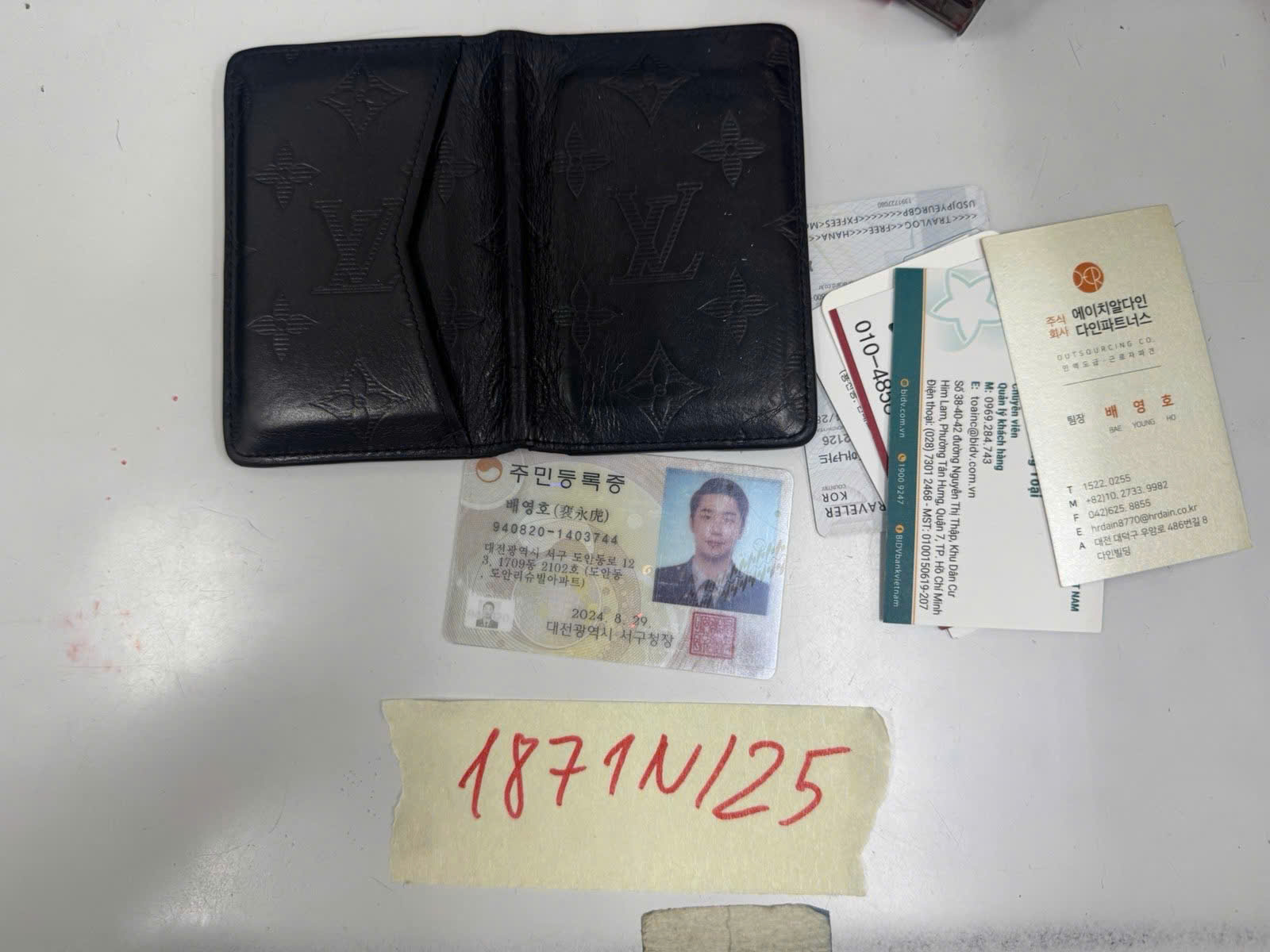 Ngày tiếp nhận: 17/10/2025 Mã hồ sơ: 1871N2025 Mô tả: 01 bóp da màu đen bên trong chứa nhiều thẻ nhựa cùng tên BAE YOUNG HO. |