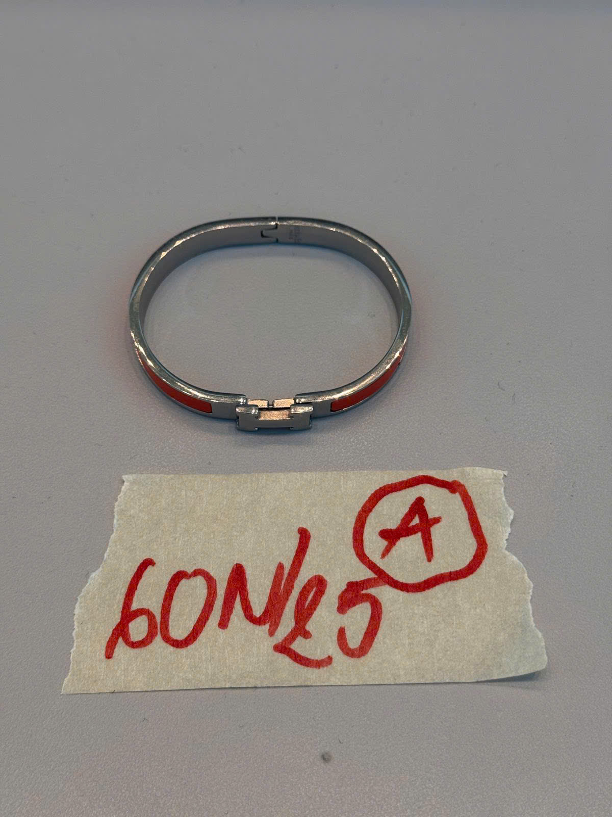 Ngày tiếp nhận: 17/10/2025 Mã hồ sơ: 60N2025A Mô tả: 01 vòng tay màu trắng có viền màu cam, có chữ "HERMES PARIS". |