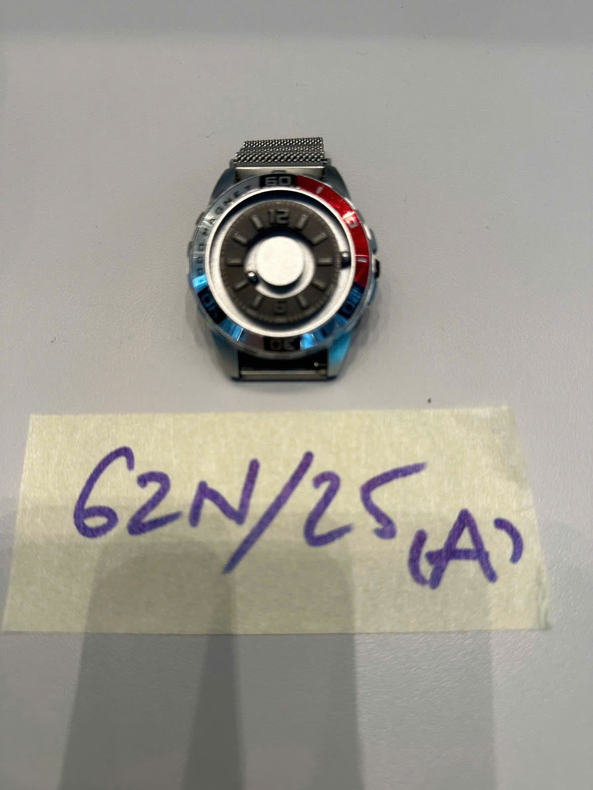 Ngày tiếp nhận: 18/10/2025 Mã hồ sơ: 62N2025A Mô tả: 01 đồng hồ kim loại màu bạc, mặt tròn MAGNET. |