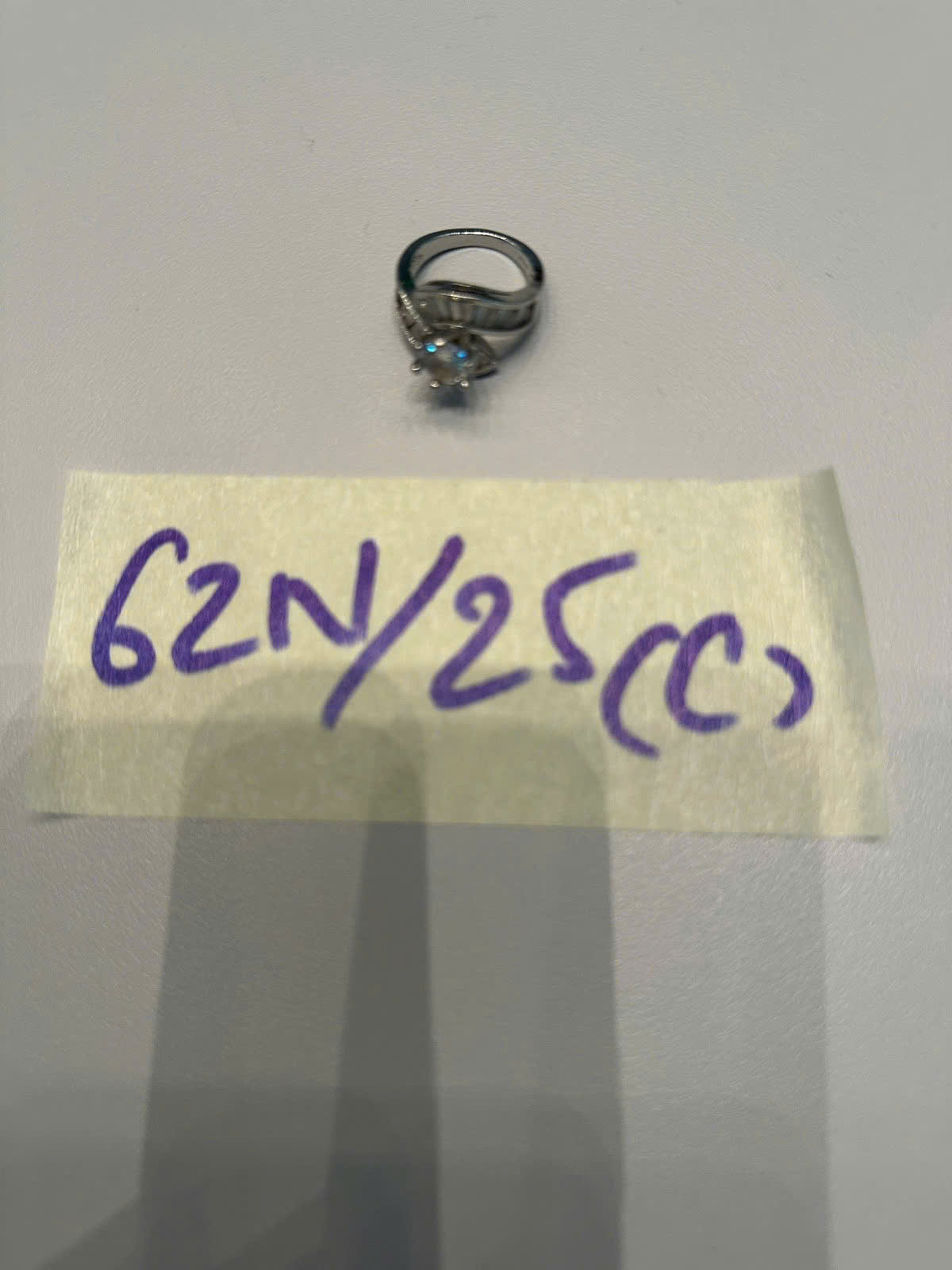 Ngày tiếp nhận: 18/10/2025 Mã hồ sơ: 62N2025C Mô tả: 01 nhẫn kim loại màu bạc có đính đá to. |