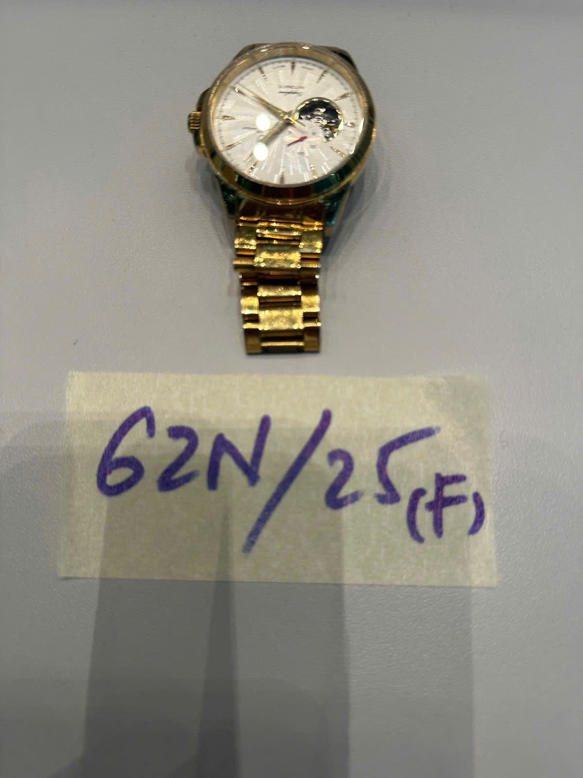 Ngày tiếp nhận: 18/10/2025 Mã hồ sơ: 62N2025F Mô tả: 01 đồng hồ màu vàng mặt trắng có chữ "DINAUS". |