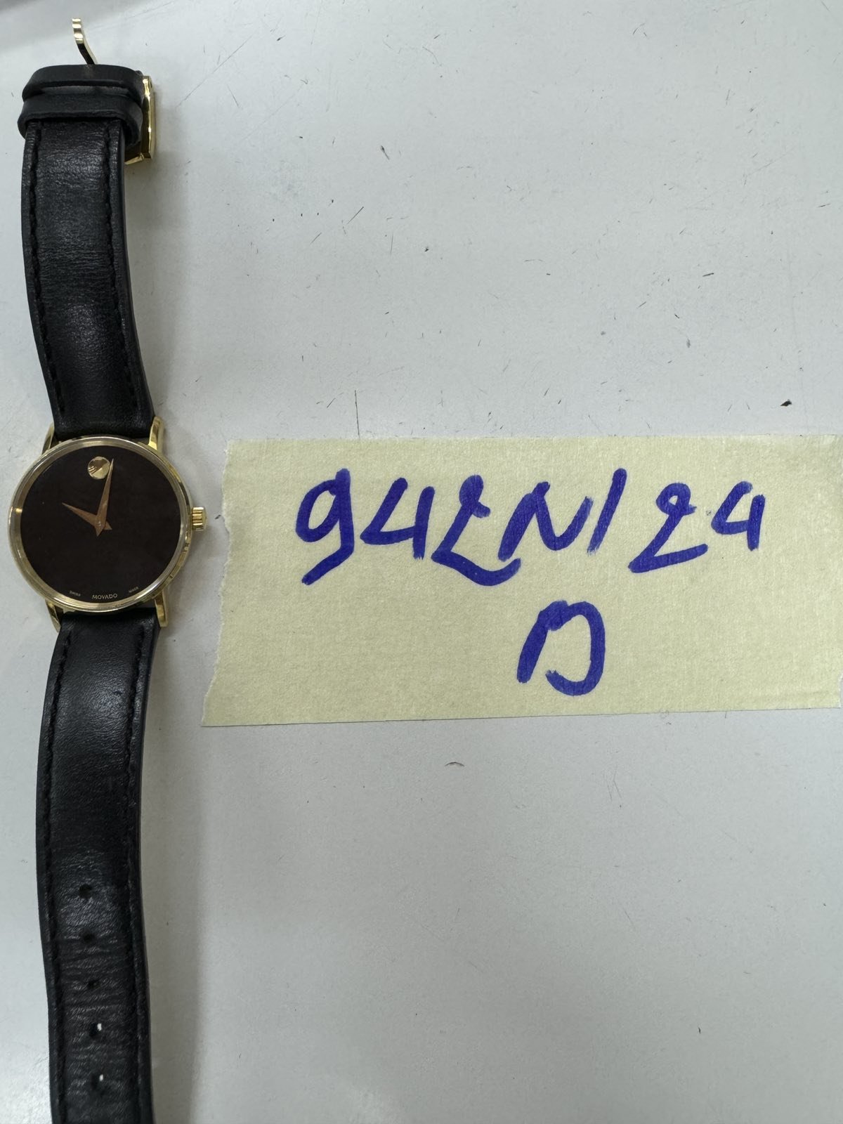 Ngày tiếp nhận: 18/6/2024 Mã hồ sơ: 942N2024B Mô tả: 01 đồng hồ đeo tay bằng da, mặt đồng hồ viền kim loại màu vàng và hình tròn có logo chữ MOVADO. |