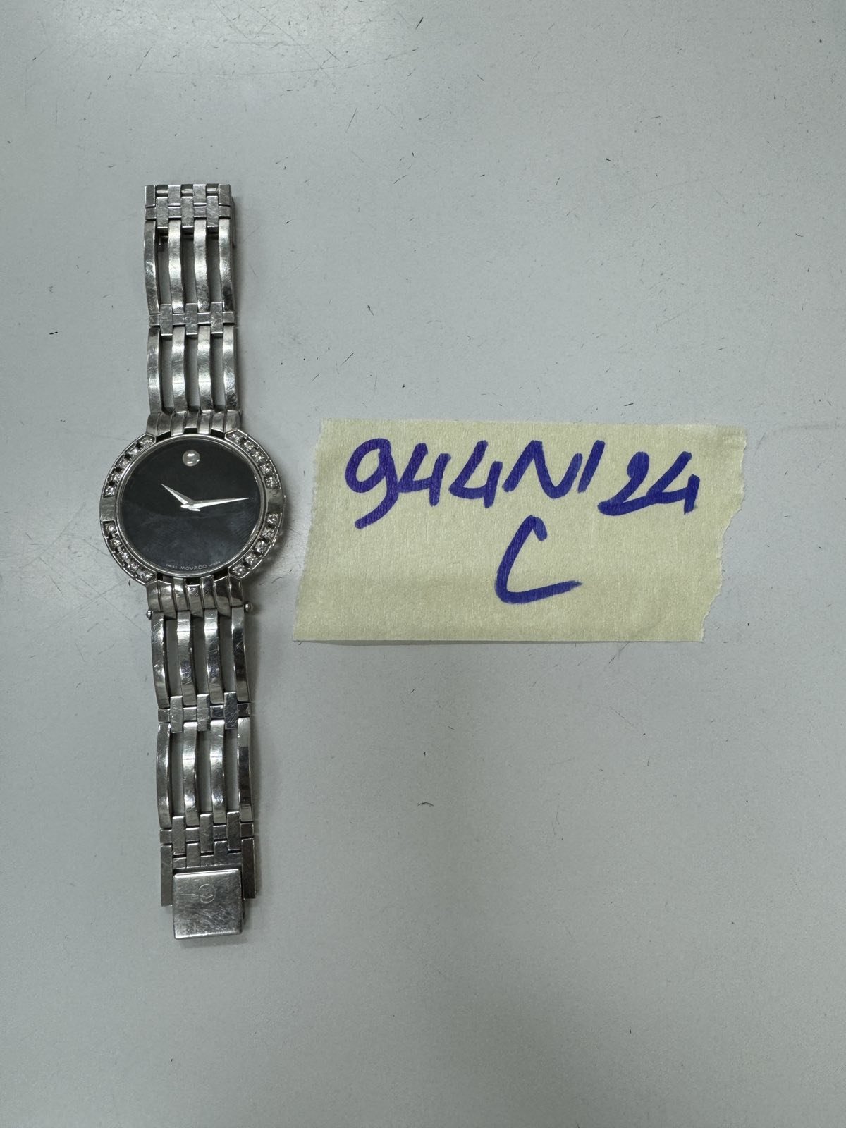 Ngày tiếp nhận: 18/6/2024 Mã hồ sơ: 944N2024C Mô tả: 01 đồng hồ đeo tay có logo "MOVADO" mặt tròn, viền đính hạt màu bạc, dây kim loại. |