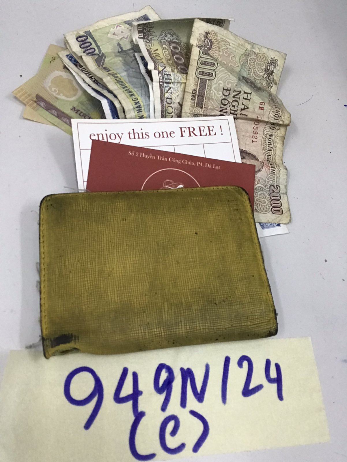 Ngày tiếp nhận: 18/6/2024 Mã hồ sơ: 949N2024C Mô tả: 01 ví da màu vàng bên trong có 04 card visit có chữ "RACKIE BURGERS", 02 tờ tiền mệnh giá 10.000 VNĐ, 05 tờ tiền mệnh giá 5.000 VNĐ, 01 tờ tiền mệnh giá 1.000 VNĐ, 01 tờ tiền mệnh giá 2.000 VNĐ. |