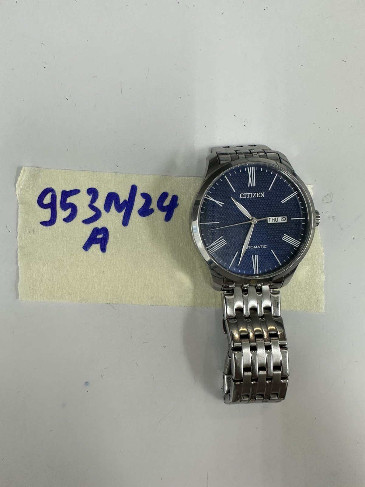 Ngày tiếp nhận: 19/6/2024 Mã hồ sơ: 953N2024A Mô tả: 01 đồng hồ kim loại màu bạc, mặt kính tròn màu xanh có chữ CITIZEN. |