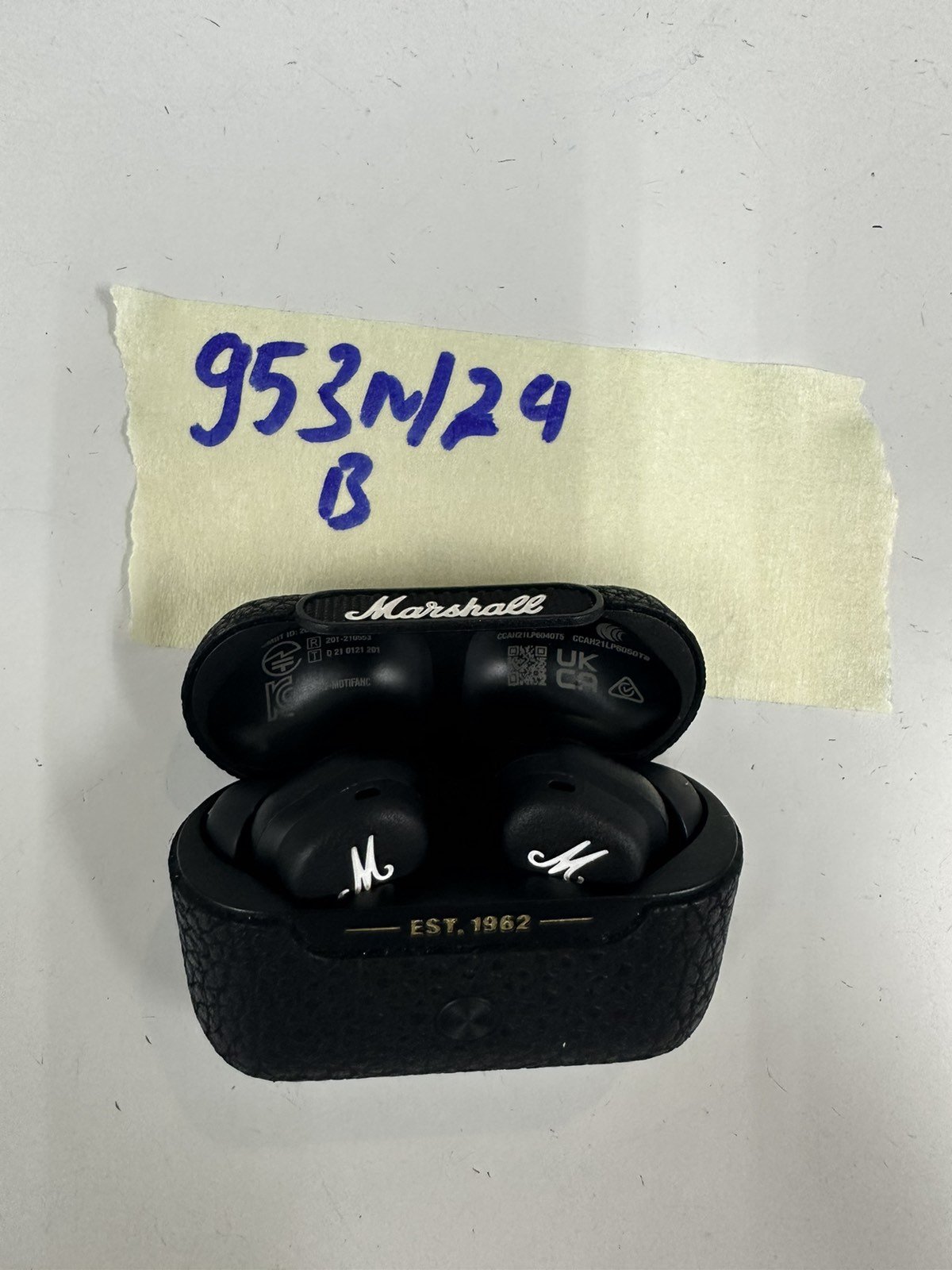 Ngày tiếp nhận: 19/6/2024 Mã hồ sơ: 953N2024B Mô tả: 01 hộp tai nghe không dây màu đen có chữ "MARSHALL" bên trong có 02 tai nghe không dây màu đen. |