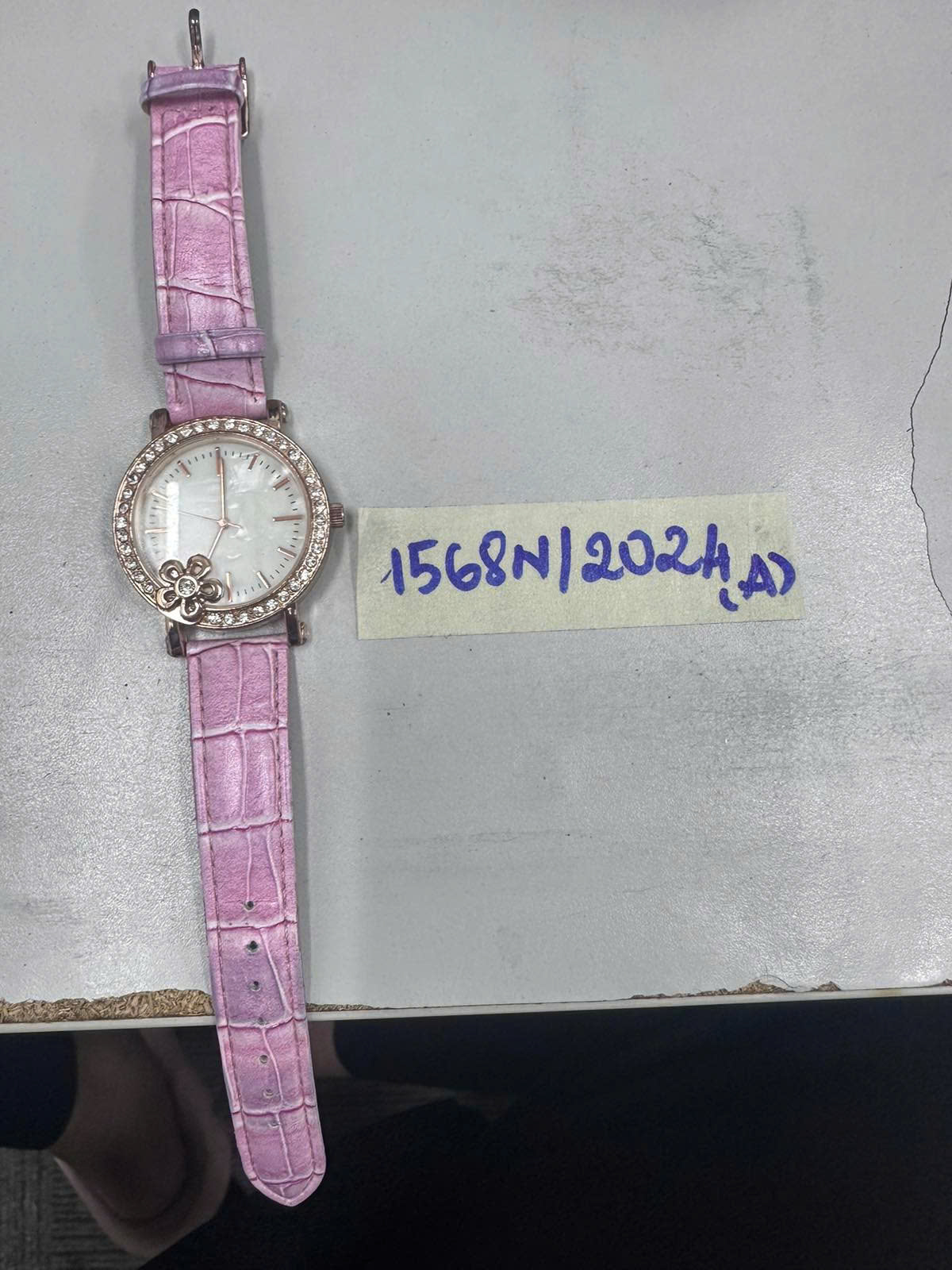 Ngày tiếp nhận: 17/9/2024 Mã hồ sơ: 1568N2024A Mô tả: 01 đồng hồ có chữ AVON mặt tròn bằng kim loại màu vàng có đính đá, dây giống da màu hồng. |