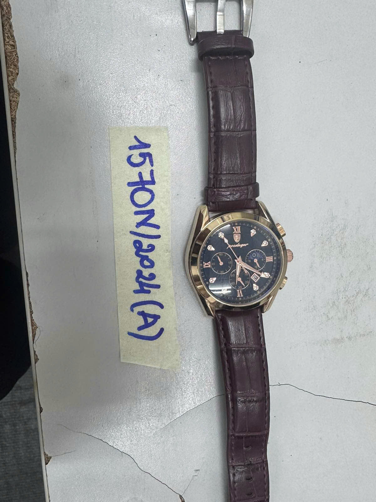 Ngày tiếp nhận: 17/9/2024 Mã hồ sơ: 1570N2024A Mô tả: 01 đồng hồ có chữ POEDAGAR mặt tròn bằng kim loại màu vàng dây da màu nâu, mặt sau có chữ 3ATM. |