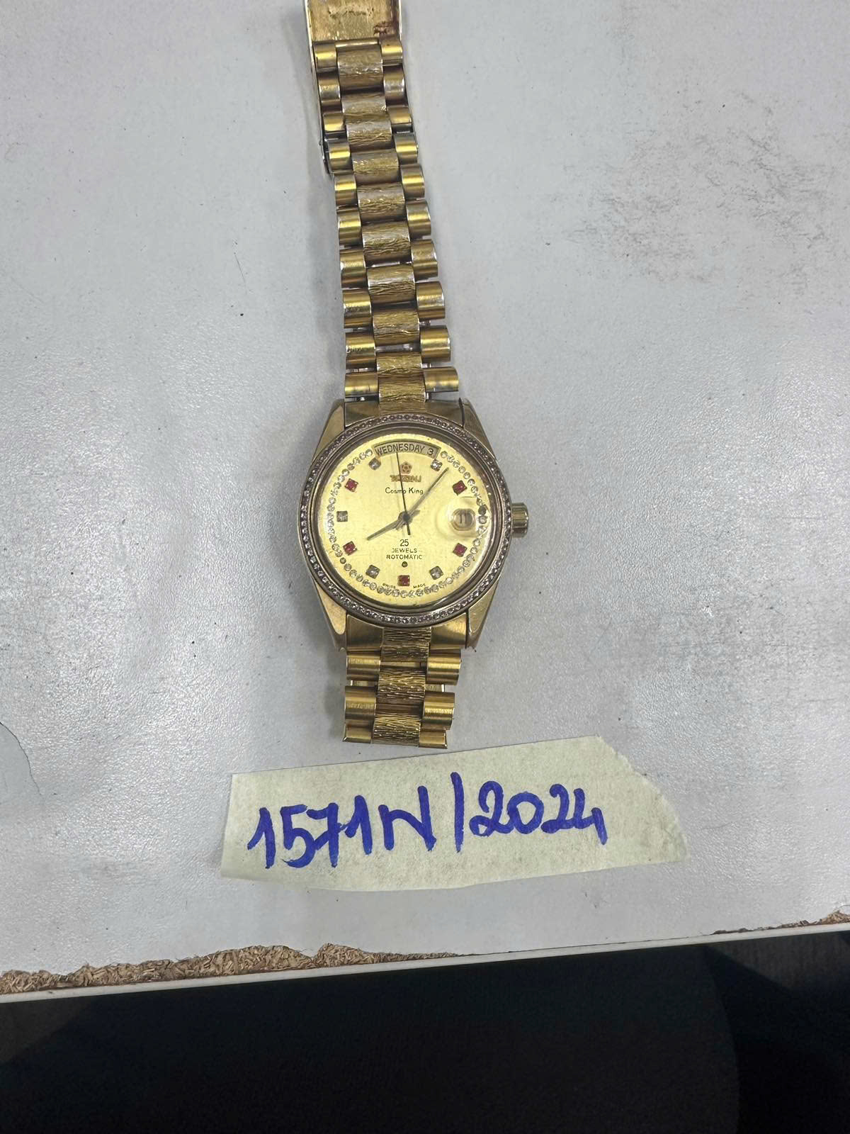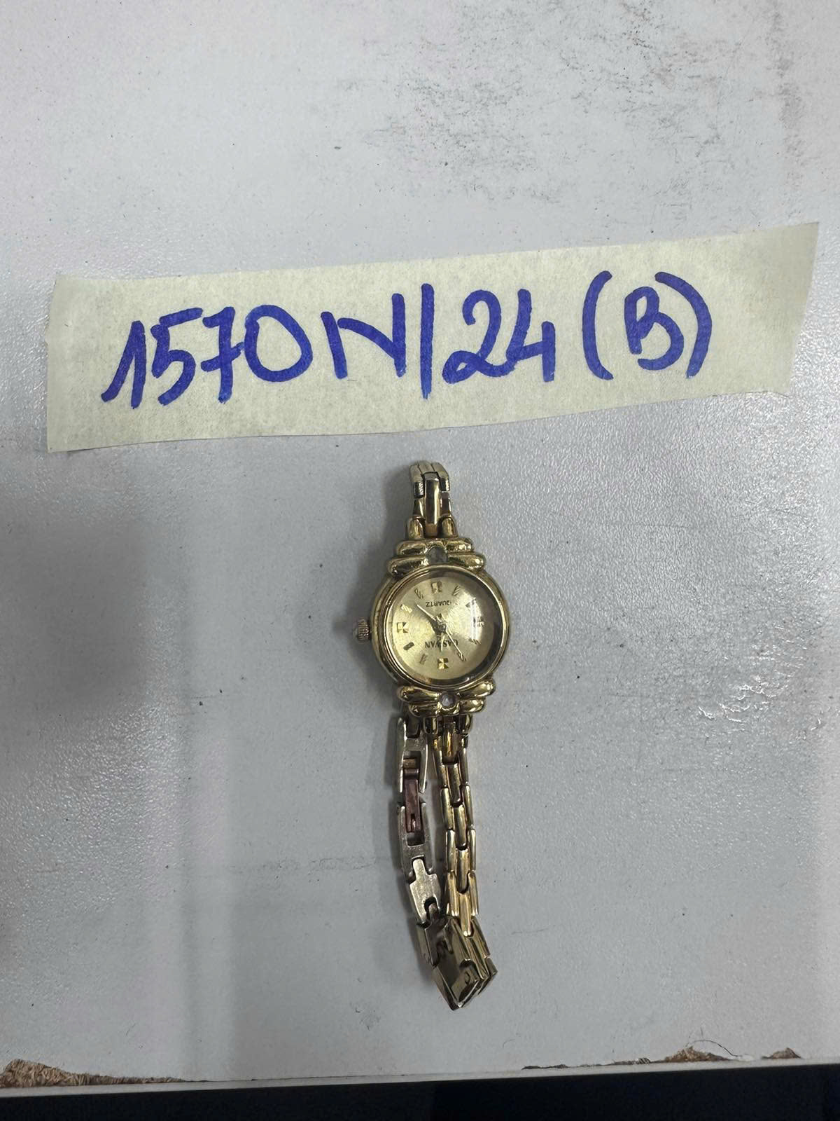 Ngày tiếp nhận: 17/9/2024 Mã hồ sơ: 1570N2024B Mô tả: 01 đồng hồ nữ màu vàng có chữ GASWAN QUATZ, dây bằng kim loại màu vàng. |