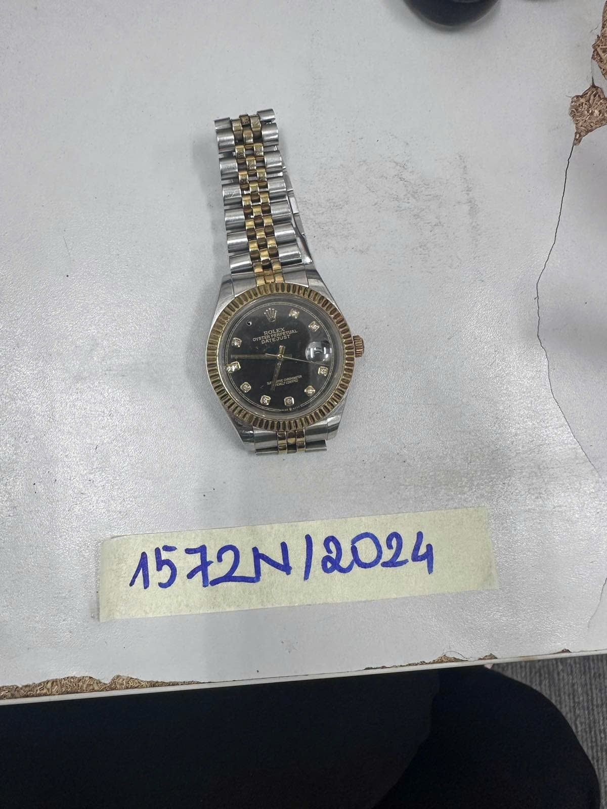 Ngày tiếp nhận: 17/9/2024 Mã hồ sơ: 1572N2024 Mô tả: 01 đồng hồ mặt hình tròn màu đen viền vàng có chữ ROLEX dây đeo kim loại màu trắng xen kẽ vàng. |