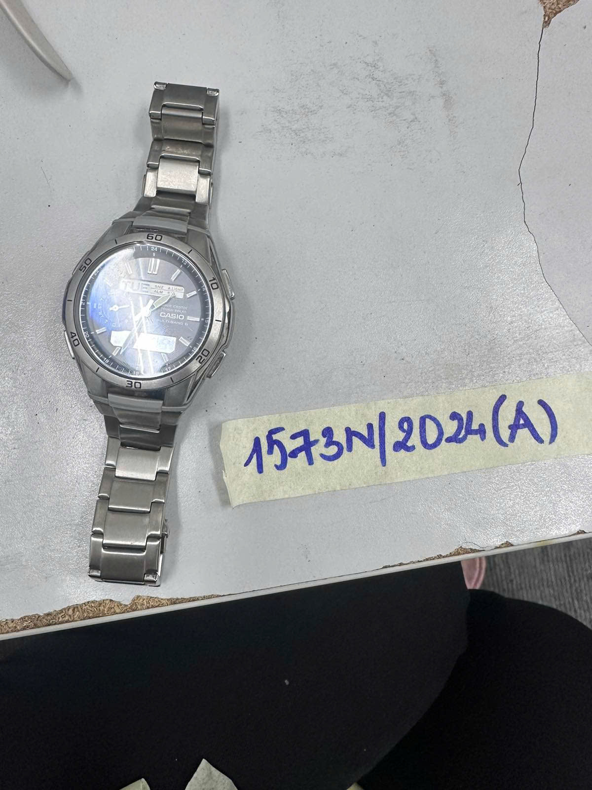 Ngày tiếp nhận: 18/9/2024 Mã hồ sơ: 1583N2024B Mô tả: 01 đồng hồ dây kim loại màu bạc, mặt đồng hồ có chữ CASIO QUARTZ. |
