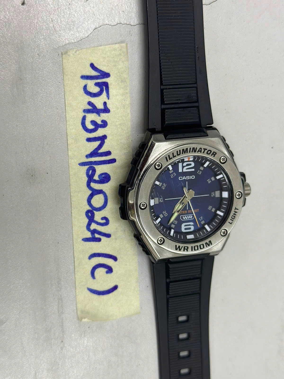 Ngày tiếp nhận: 17/9/2024 Mã hồ sơ: 1573N2024C Mô tả: 01 đồng hồ màu bạc mặt tròn có chữ CASIO dây đeo nhựa màu đen. |