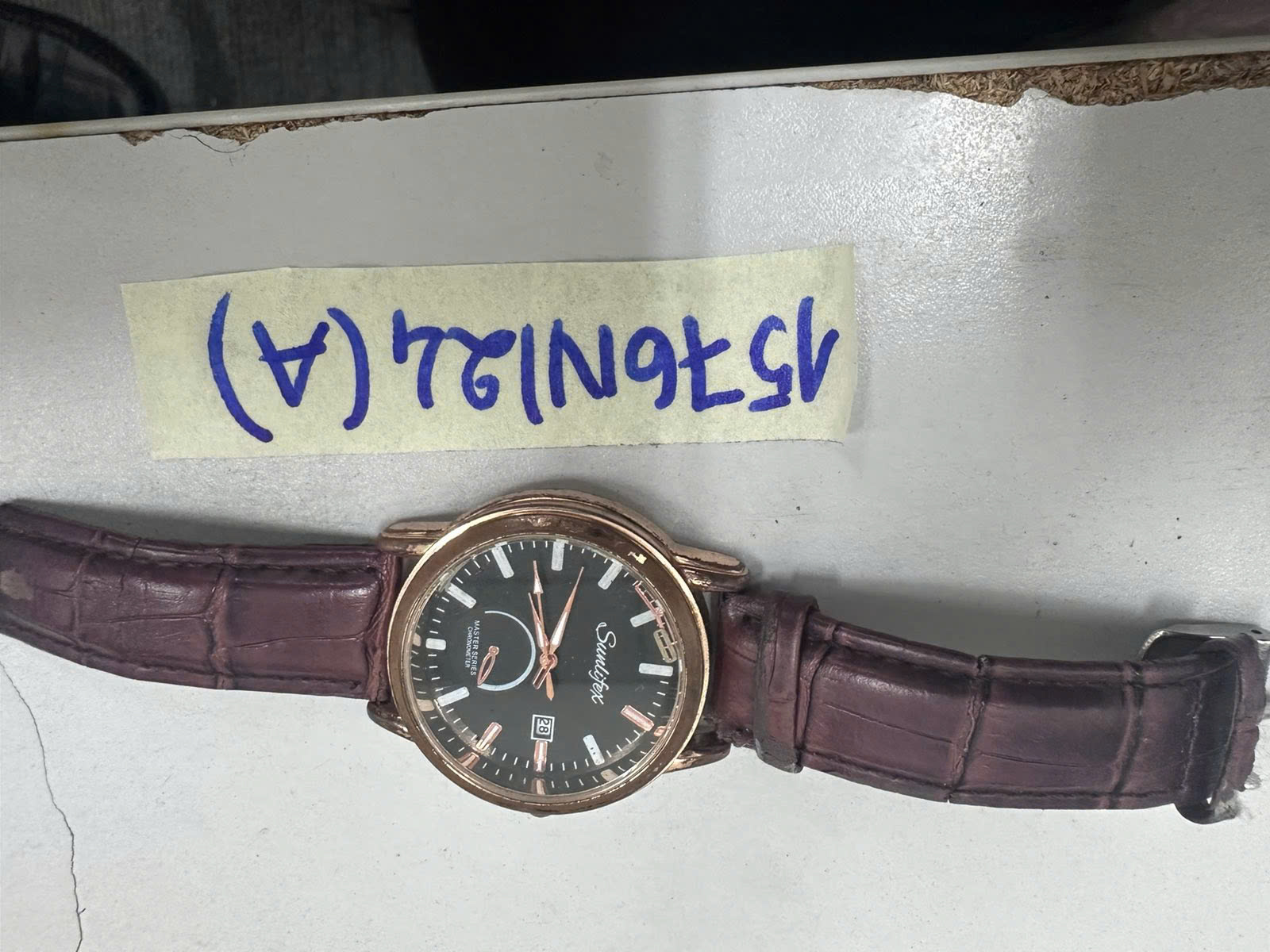 Ngày tiếp nhận: 17/9/2024 Mã hồ sơ: 1576N2024A Mô tả: 01 đồng hồ mặt tròn màu đen viền màu vàng đồng có chữ Sunlifex dây đeo bằng da màu nâu. |