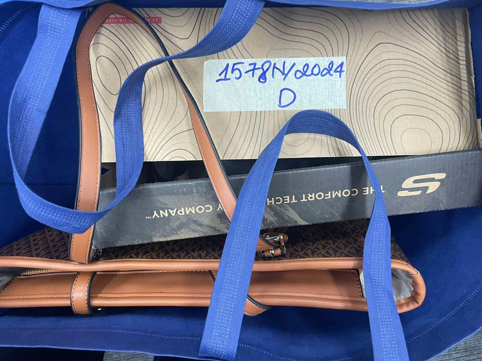 Ngày tiếp nhận: 18/9/2024 Mã hồ sơ: 1578N2024D Mô tả: 01 túi vải màu xanh dương có in chữ SKECHERS, bên trong gồm có 01 đôi giày màu nâu hiệu SKECHERS còn trong hộp, 01 túi xách màu nâu hiệu MICHAEL KORS và 01 ví màu trắng hiệu MICHAEL KORS. |