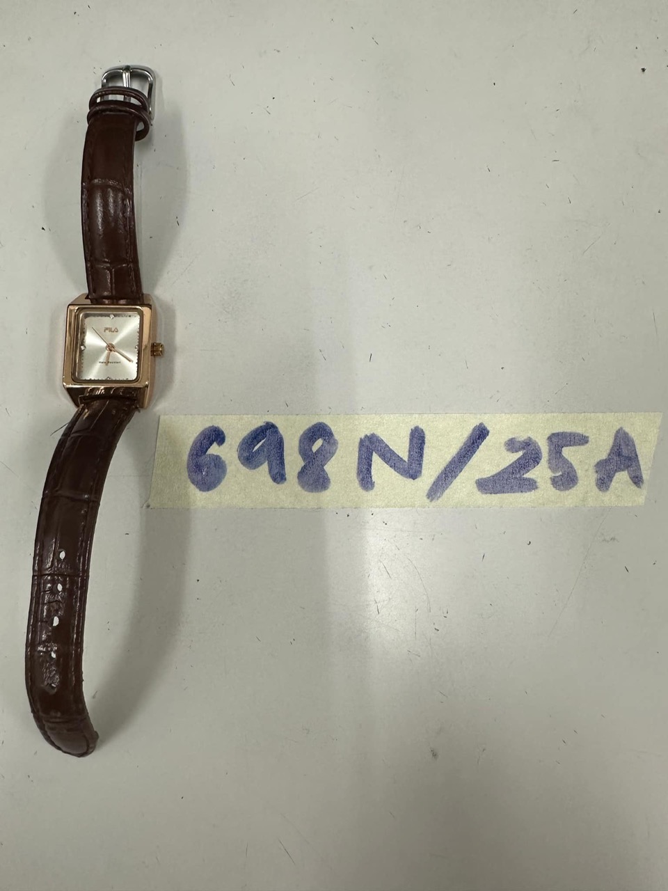 Ngày tiếp nhận: 18/4/2025 Mã hồ sơ: 698N2025A Mô tả: 01 đồng hồ đeo tay dây da màu nâu, mặt vuông có chữ "FILA". |