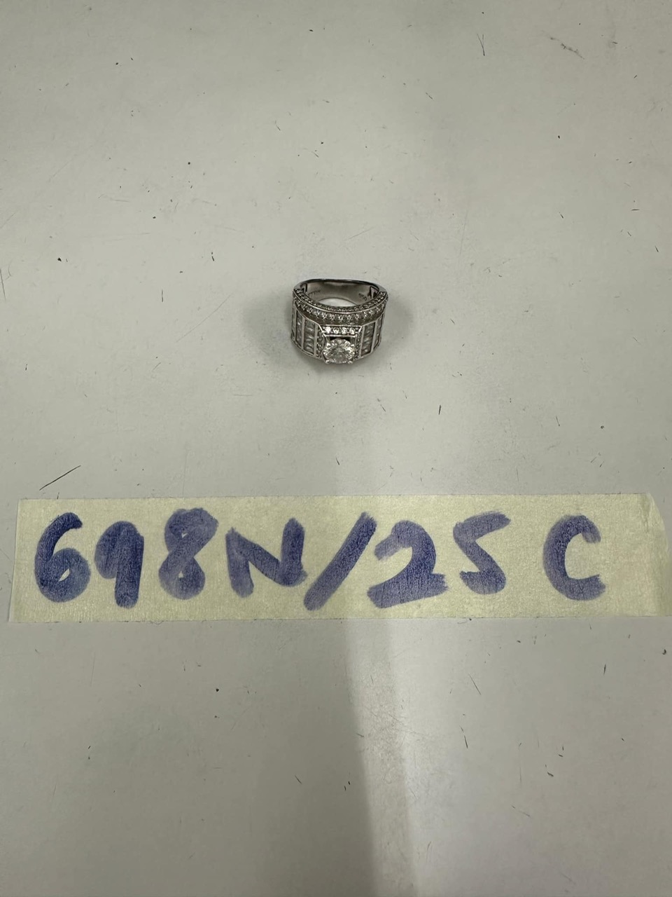 Ngày tiếp nhận: 18/4/2025 Mã hồ sơ: 698N2025C Mô tả: 01 nhẫn kim loại màu trắng có đính hột màu trắng. |