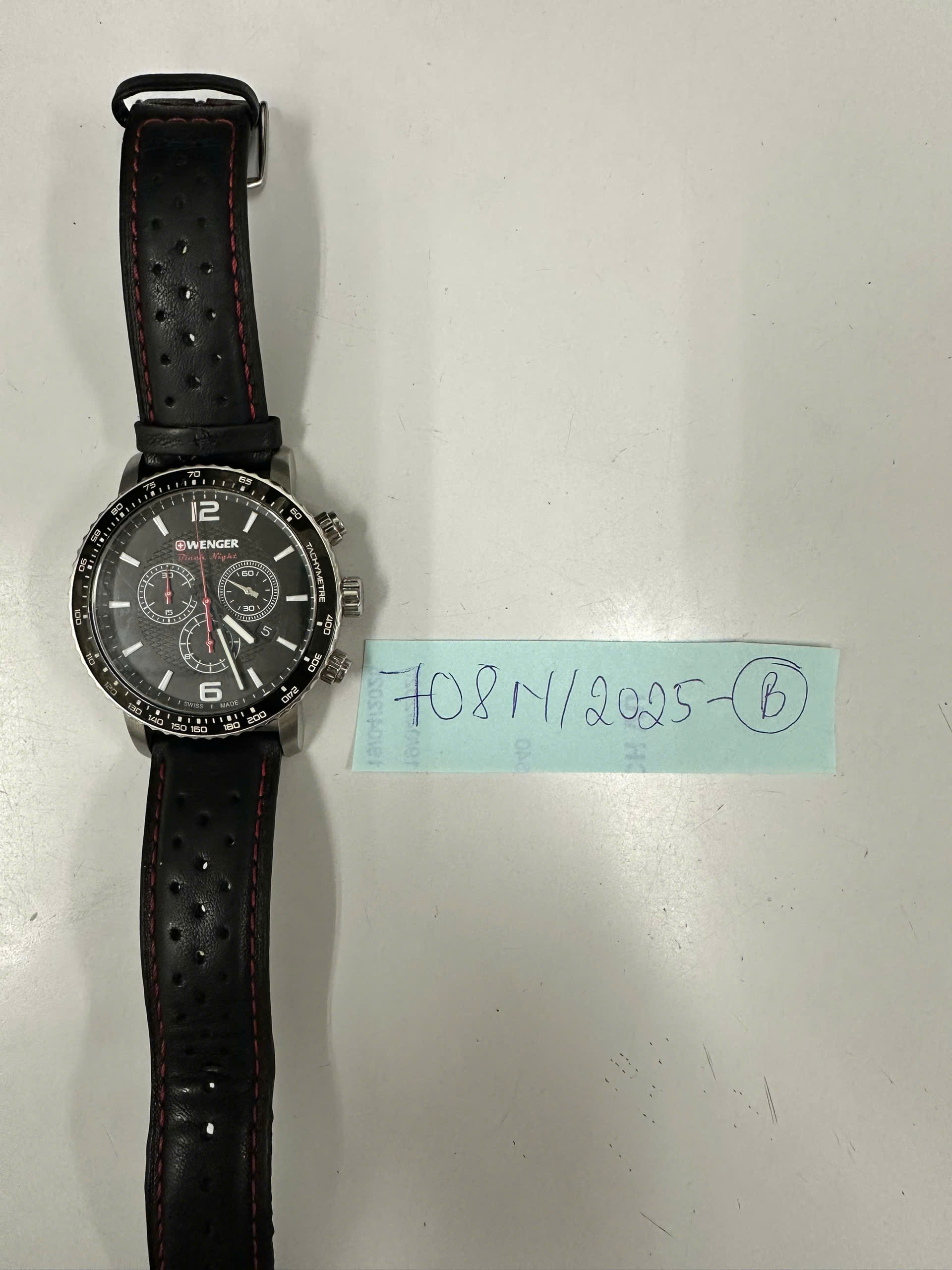Ngày tiếp nhận: 19/4/2025 Mã hồ sơ: 708N2025B Mô tả: 01 Đồng hồ mặt tròn màu trắng có chữ WENGER BLACK NIGHT, dây da màu đen. |